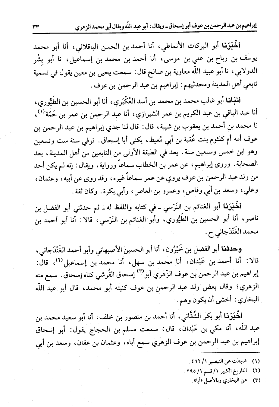 أخبرنا أبو البركات الأنماطي أنا أحمد بن الحسن الباقلاني أنا أبو محمد يوسف بن رباح بن علي بن موسى أنا أحمد بن محمد بن إسماعيل نا أبو بشر الدولابي نا أبو عبيد الله معاوية بن صالح قال سمعت يحيى بن معين يقول في تسمية تابعي أهل المدينة ومحدثيهم إبراهيم بن عبد الرحمن بن عوف أنبأنا أبو غالب محمد بن محمد بن أسد العكبري أنا أبو الحسين بن الطيوري أنا عبد الباقي بن عبد الكريم بن عمر الشيرازي أنا عبد الرحمن بن عمر بن حمة (1) نا محمد بن أحمد بن يعقوب بن شيبة قال قال لنا جدي إبراهيم بن عبد الرحمن بن عوف أمه أم كلثوم بنت عقبة بن أبي معيط يكنى أبا إسحاق توفي سنة ست وتسعين وهو ابن خمس وسبعين سنة يعد في الطبقة الأولى من التابعين من أهل المدينة بعد الصحابة وروى إبراهيم عن عمر بن الخطاب سماعا ورواية ويقال إنه لم يكن أحد من ولد عبد الرحمن بن عوف يروي عن عمر سماعا غيره وقد روى عن أبيه وعثمان وعلي وسعد بن أبي وقاص وعمرو بن العاص وأبي بكرة وكان ثقة أخبرنا أبو الغنائم بن النرسي في كتابه واللفظ له ثم حدثني أبو الفضل بن ناصر أنا أبو الحسين بن الطيوري وأبو الغنائم بن النرسي قالا أنا أبو أحمد بن محمد الغندجاني وحدثنا أبو الفضل بن خيرون أنا أبو الحسين الاصبهاني وأبو أحمد الغندجاني قالا أنا أحمد بن عبدان أنا محمد بن سهل أنا محمد بن إسماعيل (2) قال إبراهيم بن عبد الرحمن بن عوف الزهري أبو (3) إسحاق القرشي كناه إسحاق سمع منه الزهري وقال بعض ولد عبد الرحمن بن عوف كنيته أبو محمد قال أبو عبد الله البخاري أخشى أن يكون وهم أخبرنا أبو بكر الشقاني أنا أحمد بن منصور بن خلف أنا أبو سعيد محمد بن عبد الله أنا مكي بن عبدان قال سمعت مسلم بن الحجاج يقول أبو إسحاق إبراهيم بن عبد الرحمن بن عوف الزهري سمع أباه وعثمان بن عفان وسعد بن أبي