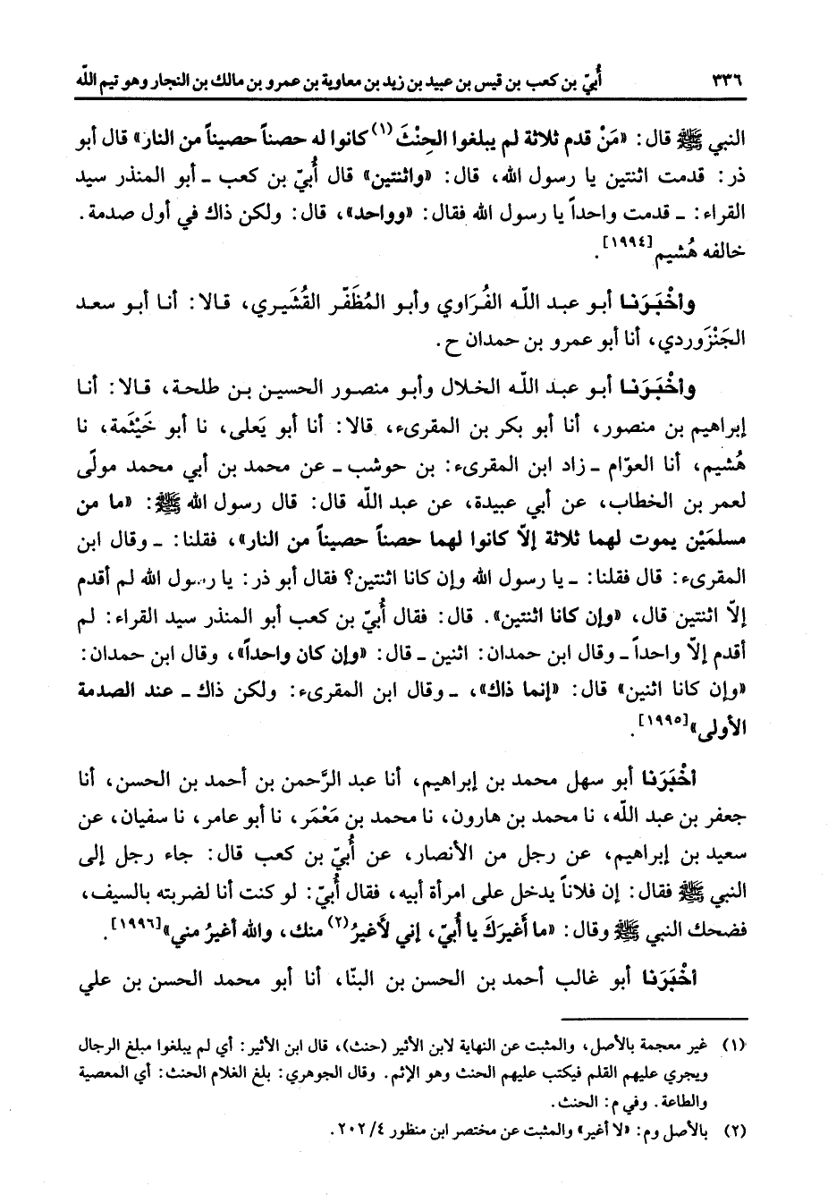 النبي (صلى الله عليه وسلم) قال (من قدم ثلاثة لم يبلغوا الحنث (1) كانوا له حصنا حصينا من النار) قال أبو ذر قدمت اثنتين يا رسول الله قال (واثنتين) قال أبي بن كعب أبو المنذر سيد القراء قدمت واحدا يا رسول الله فقال (وواحد) قال ولكن ذاك في أول صدمة خالفه هشيم وأخبرنا أبو عبد الله الفراوي وأبو المظفر القشيري قالا أنا أبو سعد الجنزرودي أنا أبو عمرو بن حمدان وأخبرنا أبو عبد الله الخلال وأبو منصور الحسين بن طلحة قالا أنا إبراهيم بن منصور أنا أبو بكر بن المقرئ قالا أنا أبو يعلى نا أبو خيثمة نا هشيم أنا العوام زاد ابن المقرئ بن حوشب عن محمد بن أبي محمد مولى لعمر بن الخطاب عن أبي عبيدة عن عبد الله قال قال رسول الله (صلى الله عليه وسلم) (ما من مسلمين يموت لهما ثلاثة إلا كانوا لهما حصنا حصينا من النار) فقلنا وقال ابن المقرئ قال فقلنا يا رسول الله وإن كانا اثنتين فقال أبو ذر يا رسول الله لم أقدم إلا اثنتين قال (وإن كانا اثنتين) قال فقال أبي بن كعب أبو المنذر سيد القراء لم أقدم إلا واحدا وقال ابن حمدان اثنين قال (وإن كان واحدا) وقال ابن حمدان وإن كانا اثنين قال (إنما ذاك) وقال ابن المقرئ ولكن ذاك عند الصدمة الأولى أخبرنا أبو سهل محمد بن إبراهيم أنا عبد الرحمن بن أحمد بن الحسن أنا جعفر بن عبد الله نا محمد بن هارون نا محمد بن معمر نا أبو عامر نا سفيان عن سعيد بن إبراهيم عن رجل من الأنصار عن أبي بن كعب قال جاء رجل إلى النبي (صلى الله عليه وسلم) فقال إن فلانا يدخل على امرأة أبيه فقال أبي لو كنت أنا لضربته بالسيف فضحك النبي (صلى الله عليه وسلم) وقال (ما أغيرك يا أبي إني لأغير (2) منك والله أغير مني) أحبرنا أبو غالب أحمد بن الحسن بن البنا أنا أبو محمد الحسن بن علي