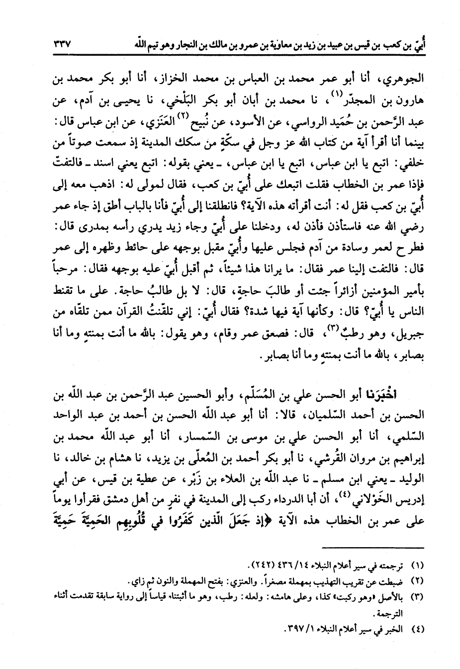 الجوهري أنا أبو عمر محمد بن العباس بن محمد الخزاز أنا أبو بكر محمد بن هارون بن المجدر (1) نا محمد بن أبان أبو بكر البلخي نا يحيى بن ادم عن عبد الرحمن بن حميد الرواسي عن الأسود عن نبيح (2) العنزي عن ابن عباس قال بينما أنا أقرأ اية من كتاب الله عز وجل في سكة من سكك المدينة إذ سمعت صوتا من خلفي اتبع يا ابن عباس اتبع يا ابن عباس يعني بقوله اتبع يعني اسند فالتفت فإذا عمر بن الخطاب فقلت اتبعك على أبي بن كعب فقال لمولى له إذهب معه إلى أبي بن كعب فقل له أنت أقرأته هذه الاية فانطلقنا إلى أبي فأنا بالباب أطق إذ جاء عمر Bهـ فاستأذن فأذن له ودخلنا على أبي وجاء زيد يدري رأسه بمدرى قال فطرح لعمر وسادة من ادم فجلس عليها وأبي مقبل بوجهه على حائط وظهره إلى عمر قال فالتفت إلينا عمر فقال ما يرانا هذا شيئا ثم أقبل أبي عليه بوجهه فقال مرحبا بأمير المؤمنين أزائرا جئت أو طالب حاجة قال لا بل طالب حاجة على ما تقنط الناس يا أبي قال وكأنها اية فيها شدة فقال أبي إني تلقنت القرآن ممن تلقاه من جبريل وهو رطب (3) قال فصعق عمر وقام وهو يقول بالله ما أنت بمنته وما أنا بصابر بالله ما أنت بمنته وما أنا بصابر أخبرنا أبو الحسن علي بن مسلم وأبو الحسين عبد الرحمن بن عبد الله بن الحسن بن أحمد السلميان قالا أنا أبو عبد الله الحسن بن أحمد بن عبد الواحد السلمي أنا أبو الحسن علي بن موسى بن السمسار أنا أبو عبد الله محمد بن إبراهيم بن مروان القرشي نا أبو بكر أحمد بن المعلى بن يزيد نا هشام بن خالد نا الوليد يعني ابن مسلم نا عبد الله بن العلاء بن زبر عن عطية بن قيس عن أبي إدريس الخولاني (4) أن أبا الدرداء ركب إلى المدينة في نفر من أهل دمشق فقرأوا يوما على عمر بن الخطاب هذه الاية " إذ جعل الذين كفروا في قلوبهم الحمية حمية " "