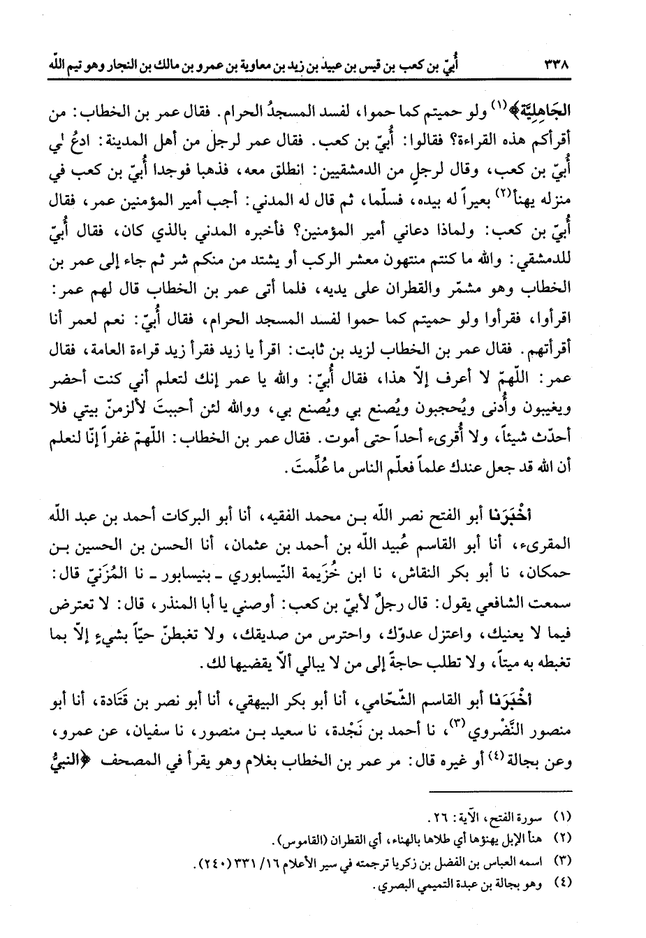 الجاهلية (1) ولو حميتم كما حموا لفسد المسجد الحرام فقال عمر بن الخطاب من أقرأكم هذه القراءة فقالوا أبي بن كعب فقال عمر لرجل من أهل المدينة ادع لي أبي بن كعب وقال لرجل من الدمشقين انطلق معه فذهبا فوجدا أبي بن كعب في منزله يهنأ (2) بعيرا له بيده فسلما ثم قال له المدني أجب أمير المؤمنين عمر فقال أبي بن كعب ولماذا دعاني أمير المؤمنين فأخبره المدني بالذي كان فقال أبي للدمشقي والله ما كنتم منتهون معشر الركب أو يشتد من منكم شر ثم جاء إلى عمر بن الخطاب وهو مشمر والقطران على يديه فلما أتى عمر بن الخطاب قال لهم عمر اقرأوا فقرأوا ولو حميتم كما حموا لفسد المسجد الحرام فقال أبي نعم لعمر أنا أقرأتهم فقال عمر بن الخطاب لزيد بن ثابت اقرأ يا زيد فقرأ زيد قراءة العامة فقال عمر اللهم لا أعرف إلا هذا فقال أبي والله يا عمر إنك لتعلم إني كنت أحضر ويغيبون وأدنى ويحجبون ويصنع بي ويصنع بي ووالله لئن أحببت لألزمن بيتي فلا أحدث شيئا ولا أقرئ أحدا حتى أموت فقال عمر بن الخطاب اللهم غفرا إنا لنعلم أن الله قد جعل عندك علما فعلم الناس ما علمت أخبرنا أبو الفتح نصر الله بن محمد الفقيه أنا أبو البركات أحمد بن عبد الله المقرئ أنا أبو القاسم عبيد الله بن أحمد بن عثمان أنا الحسن بن الحسين بن حمكان نا أبو بكر النقاش نا ابن خزيمة النيسابوري بنيسابور نا المزني قال سمعت الشافعي يقول قال رجل لأبي بن كعب أوصني يا أبا المنذر قال لا تعترض فيما لا يعنيك واعتزل عدوك واحترس من صديقك ولا تغبطن حيا بشئ إلا بما تغبطه به ميتا ولا تطلب حاجة إلى من لا يبالي ألا يقضيها لك أخبرنا أبو القاسم الشحامي أنا أبو بكر البيهقي أنا أبو نصر بن قتادة أنا أبو منصور النضروي (3) نا أحمد بن نجدة نا سعيد بن منصور نا سفيان عن عمرو وعن بجالة (4) أو غيره قال مر عمر بن الخطاب بغلام وهو يقرأ في المصحف " النبي