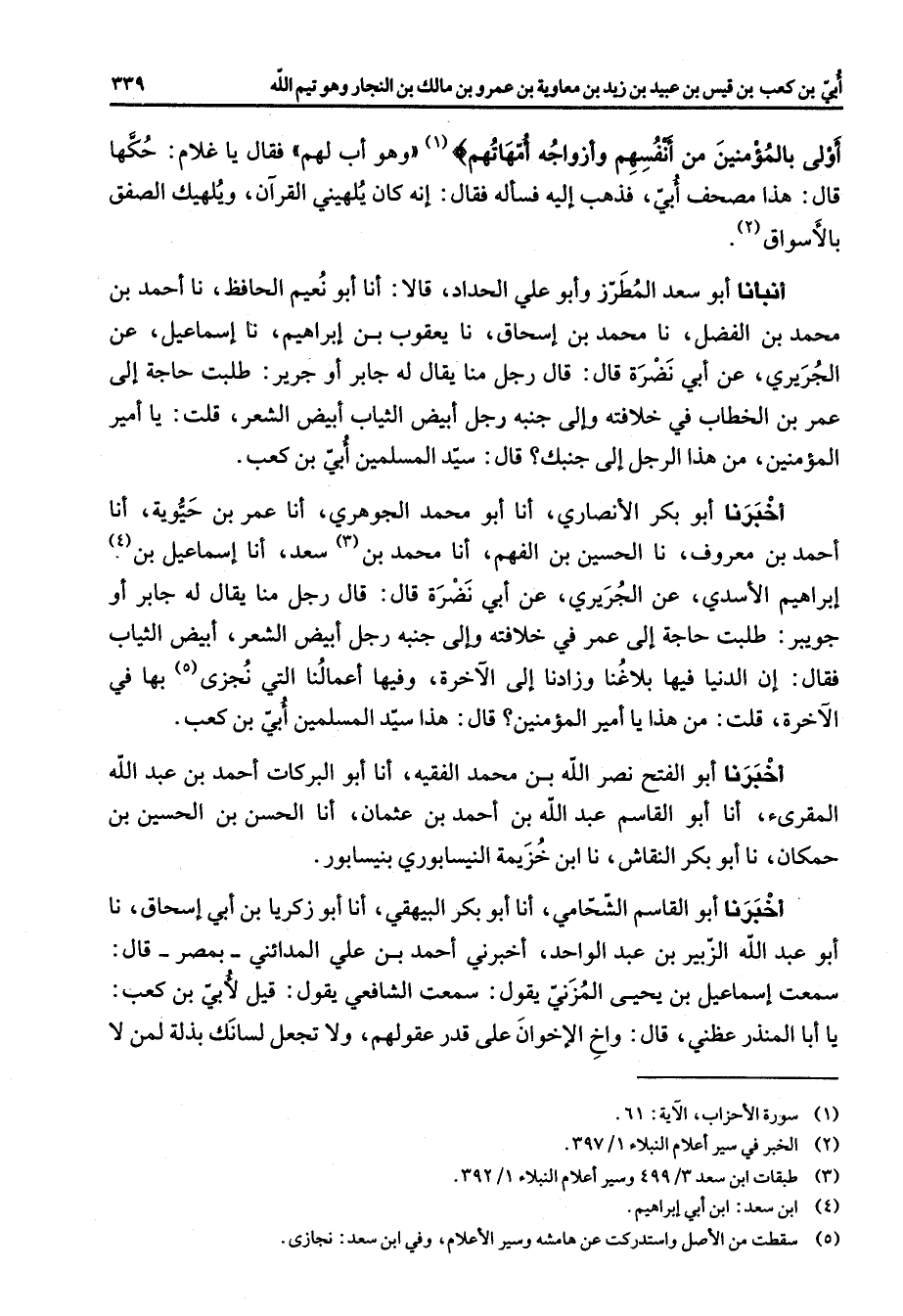 أولى بالمؤمنين من أنفسهم وأزواجه أمهاتهم (1) " وهو أب لهم فقال يا غلام حكها قال هذا مصحف أبي فذهب إليه فسأله فقال إنه كان يلهيني القرآن ويلهيك الصفق بالأسواق (2) أنبأنا أبو سعد المطرز وأبو علي الحداد قالا أنا أبو نعيم الحافظ نا أحمد بن محمد بن الفضل نا محمد بن إسحاق نا يعقوب بن إبراهيم نا إسماعيل عن الجريري عن أبي نضرة قال قال رجل منا يقال له جابر أو جرير طلبت حاجة إلى عمر بن الخطاب في خلافته وإلى جنبه رجل أبيض الثياب أبيض الشعر قلت يا أمير المؤمنين من هذا الرجل إلى جنبك قال سيد المسلمين أبي بن كعب أخبرنا أبو بكر الأنصاري أنا أبو محمد الجوهري أنا عمر بن حيوية أنا أحمد بن معروف نا الحسين بن الفهم أنا محمد بن (3) سعد أنا إسماعيل بن (4) إبراهيم الأسدي عن الجريري عن أبي نضرة قال قال رجل منا يقال له جابر أو جويبر طلبت حاجة إلى عمر في خلافته وإلى جنبه رجل أبيض الشعر أبيض الثياب فقال إن الدنيا فيها بلاغنا وزادنا إلى الاخرة وفيها أعمالنا التي نجزى (5) بها في الاخرة قلت من هذا يا أمير المؤمنين قال هذا سيد المسلمين أبي بن كعب أخبرنا أبو الفتح نصر الله بن محمد الفقيه أنا أبو البركات أحمد بن عبد الله المقرئ أنا أبو القاسم عبد الله بن أحمد بن عثمان أنا الحسن بن الحسين بن حمكان نا أبو بكر النقاش نا ابن خزيمة النيسابوري بنيسابور أخبرنا أبو القاسم الشحامي أنا أبو بكر البيهقي أنا أبو زكريا بن أبي إسحاق نا أبو عبد الله الزبير بن عبد الواحد أخبرني أحمد بن علي المدائني بمصر قال سمعت إسماعيل بن يحيى المزني يقول سمعت الشافعي يقول قيل لأبي بن كعب يا أبا المنذر عظني قال واخ الإخوان على قدر عقولهم ولا تجعل لسانك بذلة لمن لا