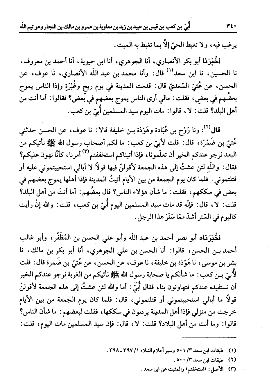 يرغب فيه ولا تغبط الحي إلا بما تغبط به الميت أخبرنا أبو بكر الأنصاري أنا الجوهري أنا ابن حيوية أنا أحمد بن معروف نا الحسين نا ابن سعد (1) قال وأنا محمد بن عبد الله الأنصاري نا عوف عن الحسن عن عتي السعدي قال قدمت المدينة في يوم ريح وغبرة وإذا الناس يموج بعضهم في بعض فقلت مالي أرى الناس يموج بعضهم في بعض فقالوا أما أنت من أهل البلد قلت لا قالوا مات اليوم سيد المسلمين أبي بن كعب قال (2) ونا روح بن عبادة وهوذة بن خليفة قالا نا عوف عن الحسن حدثني عتي بن ضمرة قال قلت لأبي بن كعب ما لكم أصحاب رسول الله (صلى الله عليه وسلم) نأتيكم من البعد نرجو عندكم الخير أن تعلمونا فإذا أتيناكم استخففتم (3) أمرنا كأنا نهون عليكم فقال والله لئن عشت إلى هذه الجمعة لأقولن فيها قولا لا أبالي استحييتموني عليه أو قتلتموني فلما كان يوم الجمعة من بين الأيام أتيت المدينة فإذا أهلها يموج بعضهم في بعض في سككهم فقلت ما شأن هؤلاء الناس قال بعضهم أما أنت من أهل البلد قلت لا قال فإنه قد مات سيد المسلمين اليوم أبي بن كعب قلت والله إن رأيت كاليوم في الستر أشد مما ستر هذا الرجل أخبرناه أبو نصر أحمد بن عبد الله وأبو علي الحسن بن المظفر وأبو غالب أحمد بن الحسن قالوا أنا الحسن بن علي الجوهري أنا أبو بكر بن مالك نا بشر بن موسى نا هوذة بن خليفة نا عوف عن الحسن عن عتي بن ضمرة قال قلت لأبي بن كعب ما شأنكم يا صحابة رسول الله (صلى الله عليه وسلم) نأتيكم من الغربة نرجو عندكم الخير أن نستفيده عندكم فتهاونون بنا فقال أبي أما والله لئن عشت إلى هذه الجمعة لأقولن قولا ما أبالي استحييتموني أو قتلتموني قال فلما كان يوم الجمعة من بين الأيام خرجت من منزلي فإذا أهل المدينة يردنون في سككها فقلت لبعضهم ما شأن الناس قالوا وما أنت من أهل البلاد قلت لا قال فإن سيد المسلمين مات اليوم قلت