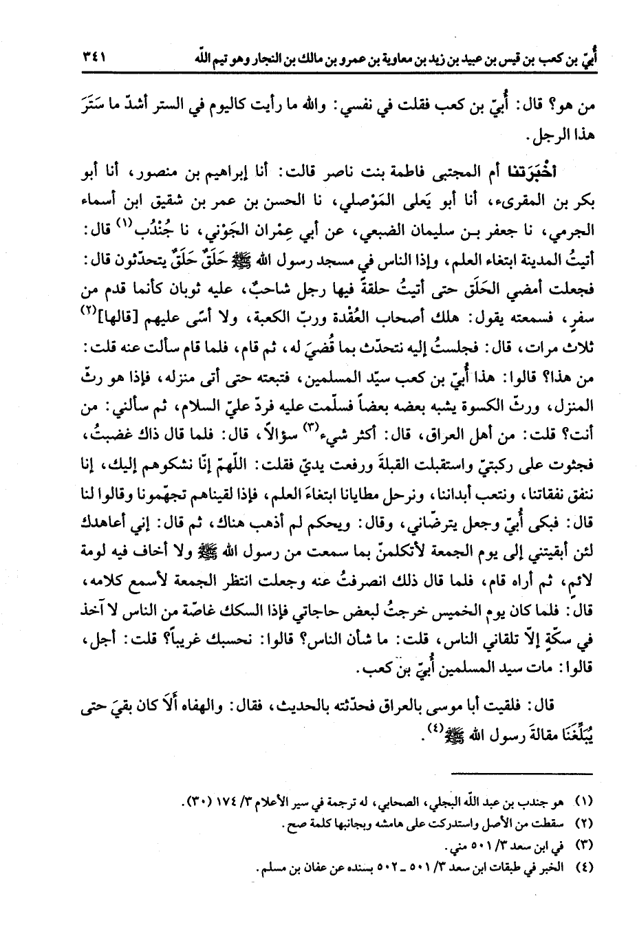 من هو قال أبي بن كعب فقلت في نفسي والله ما رأيت كاليوم في الستر أشد ما ستر هذا الرجل أخبرتنا أم المجتبى فاطمة بنت ناصر قالت أنا إبراهيم بن منصور أنا أبو بكر بن المقرئ أنا أبو يعلى الموصلي نا الحسن بن عمر بن شقيق ابن أسماء الجرمي نا جعفر بن سليمان الضبعي عن أبي عمران الجوني نا جندب (1) قال أتيت المدينة ابتغاء العلم وإذا الناس في مسجد رسول الله (صلى الله عليه وسلم) حلق حلق يتحدثون قال فجعلت أمضي الحلق حتى أتيت حلقة فيها رجل شاحب عليه ثوبان كأنما قدم من سفر فسمعته يقول هلك أصحاب العقدة ورب الكعبة ولا أسي عليهم قالها (2) ثلاث مرات قال فجلست إليه نتحدث بما قضي له ثم قام فلما قام سألت عنه قلت من هذا قالوا هذا أبي بن كعب سيد المسلمين فتبعته حتى أتى منزله فإذا هو رث المنزل ورث الكسوة يشبه بعضه بعضا فسلمت عليه فرد علي السلام ثم سألني من أنت قلت من أهل العراق قال أكثر شئ (3) سؤالا قال فلما قال ذاك غضبت فجثوت على ركبتي واستقبلت القبلة ورفعت يدي فقلت اللهم إنا نشكوهم إليك إنا ننفق نفقاتنا ونتعب أبداننا ونرحل مطايانا ابتغاء العلم فإذا لقيناهم تجهمونا وقالوا لنا قال فبكى أبي وجعل يترضاني وقال ويحكم لم أذهب هناك ثم قال إني أعاهدك لئن أبقيتني إلى يوم الجمعة لأتكلمن بما سمعت من رسول الله (صلى الله عليه وسلم) ولا أخاف فيه لومة لائم ثم أراه قام فلما قال ذلك انصرفت عنه وجعلت انتظر الجمعة لأسمع كلامه قال فلما كان يوم الخميس خرجت لبعض حاجاتي فإذا السكك غاصة من الناس لا اخذ في سكة إلا تلقاني الناس قلت ما شأن الناس قالوا نحسبك غريبا قلت أجل قالوا مات سيد المسلمين أبي بن كعب قال فلقيت أبا موسى بالعراق فحدثته بالحديث فقال والهفاه ألا كان بقي حتى يبلغنا مقالة رسول الله (صلى الله عليه وسلم) (4)