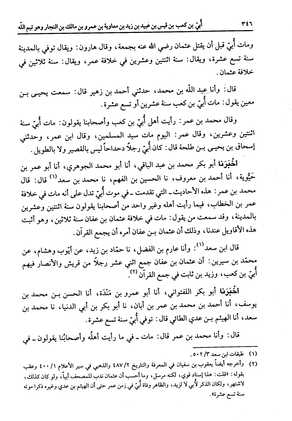 (2) وأخرجه أيضا يعقوب بن سفيان في المعرفة والتاريخ 2 / 487 والذهبي في سير الاعلام 1 / 400 وعقب بقوله: " قلت: هذا إسناد قوي لكنه مرسل وما أحسب أن عثمان ندب للمصحف أبيا ولو كان كذلك لاشهر ولكان الذكر لابي لا لزيد والظاهر وفاة أبي في زمن عمر حتى أن الهيثم بن عدي وغيره ذكرا موته سنة تسع عشرة "