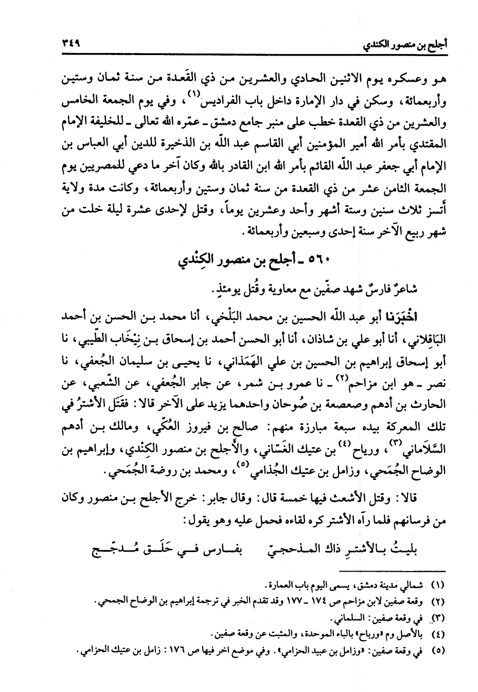 560 - أجلح بن منصور الكندي شاعر فارس شهد صفين مع معاوية وقتل يومئذ أخبرنا أبو عبد الله الحسين بن محمد البلخي أنا محمد بن الحسن بن أحمد الباقلاني أنا أبو علي بن شاذان أنا أبو الحسن أحمد بن إسحاق بن نيخاب الطيبي نا أبو إسحاق إبراهيم بن الحسين بن علي الهمذاني نا يحيى بن سليمان الجعفي نا نصر هو ابن مزاحم (2) نا عمرو بن شمر عن جابر الجعفي عن الشعبي عن الحارث بن أدهم وصعصعة بن صوحان واحدهما يزيد على الاخر قالا فقتل الأشتر في تلك المعركة بيده سبعة مبارزة منهم صالح بن فيروز العكي ومالك بن أدهم السلاماني (3) ورياح (4) بن عتيك الغساني والأجلح بن منصور الكندي وإبراهيم بن الوضاح الجمحي وزامل بن عتيك الجذامي (5) ومحمد بن روضة الجمحي قالا وقتل الأشعث فيها خمسة قال وقال جابر خرج الأجلح بن منصور وكان من فرسانهم فلما راه الأشتر كره لقاءه فحمل عليه وهو يقول بليت بالأشتر ذاك المذحجي * بفارس في حلق مدجج