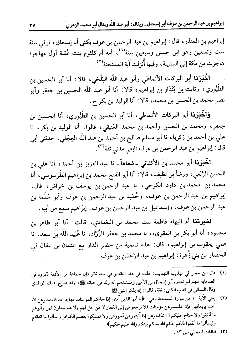 إبراهيم بن المنذر قال إبراهيم بن عبد الرحمن بن عوف يكنى أبا إسحاق توفي سنة ست وتسعين وهو ابن خمس وسبعين سنة (1) أمه أم كلثوم بنت عقبة أول مهاجرة هاجرت من مكة الى المدينة وفيها أنزلت اية الممتحنة (2) أخبرنا أبو البركات الأنماطي وأبو عبد الله البلخي قالا أنا أبو الحسين الطيوري وثابت بن بندار بن إبراهيم قالا أنا أبو عبد الله الحسين بن جعفر وأبو نصر محمد بن الحسن بن محمد قالا أنا الوليد بن بكر وأخبرنا أبو البركات الأنماطي أنا أبو الحسين بن الطيوري أنا الحسين بن جعفر ومحمد بن الحسن وأحمد بن محمد العتيقي قالوا أنا الوليد بن بكر نا علي بن أحمد بن زكريا نا أبو مسلم صالح بن أحمد بن عبد الله العجلي حدثني أبي قال إبراهيم بن عبد الرحمن بن عوف تابعي مدني ثقة (3) أخبرنا أبو محمد بن الأكفاني شفاها نا عبد العزيز بن أحمد أنا علي بن الحسن الربعي ورشأ بن نظيف قالا أنا أبو الفتح محمد بن إبراهيم الطرسوسي أنا محمد بن محمد بن داود الكرخي نا عبد الرحمن بن يوسف بن خراش قال إبراهيم بن عبد الرحمن بن عوف وحميد بن عبد الرحمن بن عوف وأبو سلمة بن عبد الرحمن بن عوف وإسماعيل بن عبد الرحمن بن عوف إبراهيم سمع من أبيه أخبرتنا أم البهاء فاطمة بنت محمد بن البغدادي قالت أنا أبو طاهر بن محمود أنا أبو بكر بن المقرئ نا محمد بن جعفر الزراد نا عبيد الله بن سعد نا عمي يعقوب بن إبراهيم قال هذه تسمية من حضر الدار مع عثمان بن عفان في الحصار من بني زهرة إبراهيم بن عبد الرحمن بن عوف