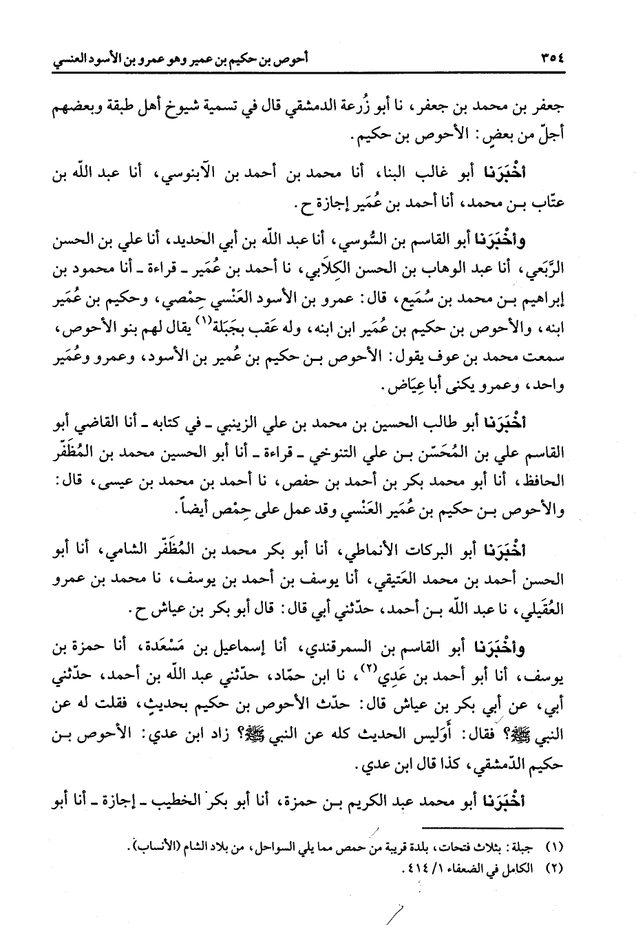 جعفر بن محمد بن جعفر نا أبو زرعة الدمشقي قال في تسمية شيوخ أهل طبقة وبعضهم أجل من بعض الأحوص بن حكيم أخبرنا أبو غالب البنا أنا محمد بن أحمد بن الابنوسي أنا عبد الله بن عتاب بن محمد أنا أحمد بن عمير إجازة وأخبرنا أبو القاسم بن السوسي أنا عبد الله بن أبي الحديد أنا علي بن الحسن الربعي أنا عبد الوهاب بن الحسن الكلابي نا أحمد بن عمير قراءة أنا محمود بن إبراهيم بن محمد بن سميع قال عمرو بن الأسود العنسي حمصي وحكيم بن عمير ابنه والأحوص بن حكيم بن عمير ابن ابنه وله عقب بجبلة (1) يقال لهم بنو الأحوص سمعت محمد بن عوف يقول الأحوص بن حكيم بن عمير بن الأسود وعمرو وعمير واحد وعمرو يكنى أبا عياض أخبرنا أبو طالب الحسين بن محمد بن علي الزينبي في كتابه أنا القاضي أبو القاسم علي بن المحسن بن علي التنوخي قراءة أنا أبو الحسين محمد بن المظفر الحافظ أنا أبو محمد بكر بن أحمد بن حفص نا أحمد بن محمد بن عيسى قال والأحوص بن حكيم بن عمير العنسي وقد عمل على حمص أيضا أخبرنا أبو البركات الأنماطي أنا أبو بكر محمد بن المظفر الشامي أنا أبو الحسن أحمد بن محمد العتيقي أنا يوسف بن أحمد بن يوسف نا محمد بن عمرو العقيلي نا عبد الله بن أحمد حدثني أبي قال قال أبو بكر بن عياش ح وأخبرنا أبو القاسم بن السمرقندي أنا إسماعيل بن مسعدة أنا حمزة بن يوسف أنا أبو أحمد بن عدي (2) نا ابن حماد حدثني عبد الله بن أحمد حدثني أبي عن أبي بكر بن عياش قال حدث الأحوص بن حكيم بحديث فقلت له عن النبي (صلى الله عليه وسلم) فقال أو ليس الحديث كله عن النبي (صلى الله عليه وسلم) زاد ابن عدي الأحوص بن حكيم الدمشقي كذا قال ابن عدي أخبرنا أبو محمد عبد الكريم بن حمزة أنا أبو بكر الخطيب إجازة أنا أبو