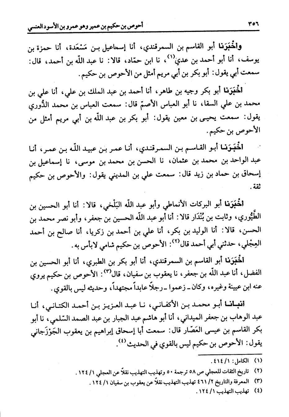 وأخبرنا أبو القاسم بن السمرقندي أنا إسماعيل بن مسعدة أنا حمزة بن يوسف أنا أبو أحمد بن عدي (1) نا ابن حماد قالا نا عبد الله بن أحمد قال سمعت أبي يقول أبو بكر بن أبي مريم أمثل من الأحوص بن حكيم أخبرنا أبو بكر وجيه بن طاهر أنا أحمد بن عبد الملك بن علي أنا علي بن محمد بن علي السقا نا أبو العباس الأصم قال سمعت العباس بن محمد الدوري يقول سمعت يحيى بن معين يقول أبو بكر بن عبد الله بن أبي مريم أمثل من الأحوص بن حكيم أخبرنا أبو القاسم بن السمرقندي أنا عمر بن عبيد الله بن عمر أنا عبد الواحد بن محمد بن عثمان نا الحسن بن محمد بن موسى نا إسماعيل بن إسحاق بن حماد بن زيد قال سمعت علي بن المديني يقول والأحوص بن حكيم ثقة أخبرنا أبو البركات الأنماطي وأبو عبد الله البلخي قالا أنا أبو الحسين بن الطيوري وثابت بن بندار قالا أنا أبو عبد الله الحسين بن جعفر وأبو نصر محمد بن الحسن قالا أنا الوليد بن بكر أنا علي بن أحمد بن زكريا أنا صالح بن أحمد العجلي حدثني أبي أحمد قال (2) الأحوص بن حكيم شامي لا بأس به أخبرنا أبو القاسم بن السمرقندي أنا أبو بكر بن الطبري أنا أبو الحسين بن الفضل أنا عبد الله بن جعفر نا يعقوب بن سفيان قال (3) الأحوص بن حكيم يروي عنه ابن عيينة وغيره وكان زعموا رجلا عابدا مجتهدا وحديثه ليس بالقوي أنبأنا أبو محمد بن الأكفاني نا عبد العزيز بن أحمد الكتاني أنا عبد الوهاب بن جعفر الميداني أنا أبو هاشم عبد الجبار بن عبد الصمد السلمي نا أبو بكر القاسم بن عيسى العصار قال سمعت أبا إسحاق إبراهيم بن يعقوب الجوزجاني يقول الأحوص بن حكيم ليس بالقوي في الحديث (4)