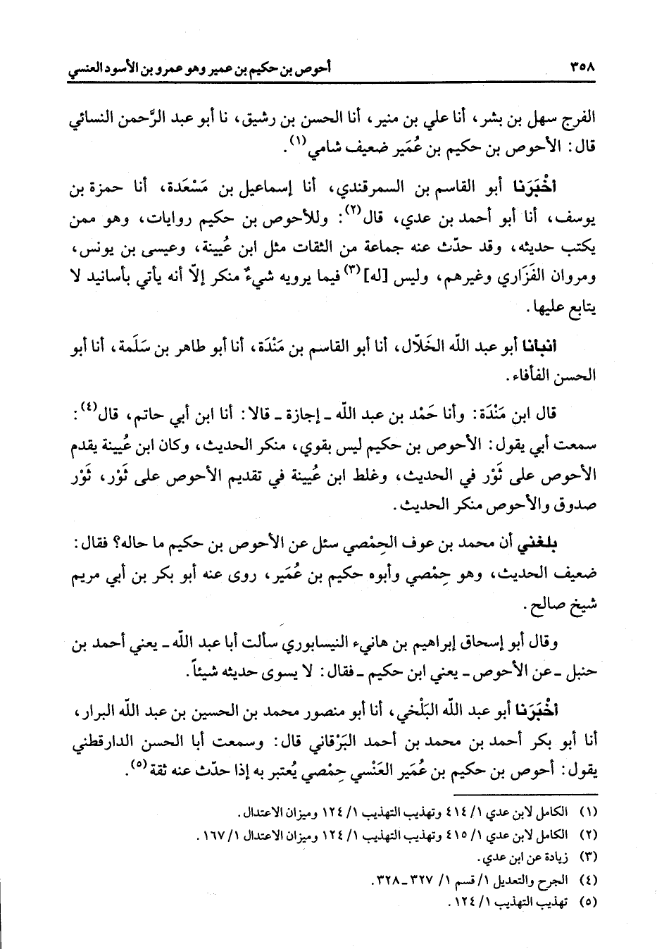 الفرج سهل بن بشر أنا علي بن منير أنا الحسن بن رشيق نا أبو عبد الرحمن النسائي قال الأحوص بن حكيم بن عمير ضعيف شامي (1) أخبرنا أبو القاسم بن السمرقندي أنا إسماعيل بن مسعدة أنا حمزة بن يوسف أنا أبو أحمد بن عدي قال (2) وللأحوص بن حكيم روايات وهو ممن يكتب حديثه وقد حدث عنه جماعة من الثقات مثل ابن عيينة وعيسى بن يونس ومروان الفزاري وغيرهم وليس له (3) فيما يرويه شئ منكر إلا أنه يأتي بأسانيد لا يتابع عليها أنبأنا أبو عبد الله الخلال أنا أبو القاسم بن مندة أنا أبو طاهر بن سلمة أنا أبو الحسن الفأفاء قال ابن مندة وأنا حمد بن عبد الله إجازة قالا أنا ابن أبي حاتم قال (4) سمعت أبي يقول الأحوص بن حكيم ليس بقوي منكر الحديث وكان ابن عيينة يقدم الأحوص على ثور في الحديث وغلط ابن عيينة في تقديم الأحوص على ثور ثور صدوق والأحوص منكر الحديث بلغني أن محمد بن عوف الحمصي سئل عن الأحوص بن حكيم ما حاله فقال ضعيف الحديث وهو حمصي وأبوه حكيم بن عمير روى عنه أبو بكر بن أبي مريم شيخ صالح وقال أبو إسحاق إبراهيم بن هانئ النيسابوري سألت أبا عبد الله يعني أحمد بن حنبل عن الأحوص يعني ابن حكيم فقال لا يسوى حديثه شيئا أخبرنا أبو عبد الله البلخي أنا أبو منصور محمد بن الحسين بن عبد الله البرار أنا أبو بكر أحمد بن محمد بن أحمد البرقاني قال وسمعت أبا الحسن الدارقطني يقول أحوص بن حكيم بن عمير العنسي حمصي يعتبر به إذا حدث عنه ثقة (5)