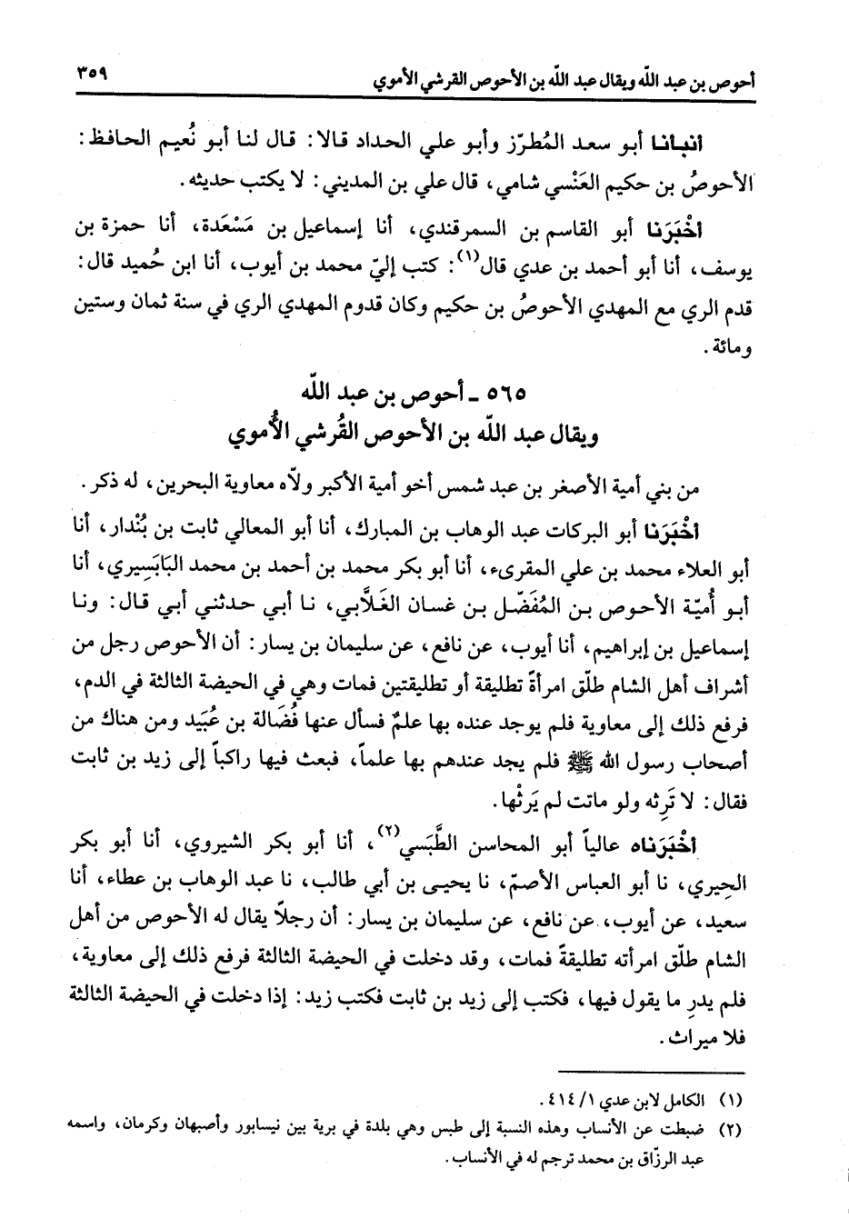 565 - أحوص بن عبد الله ويقال عبد الله بن الأحوص القرشي الأموي من بني أمية الأصغر بن عبد شمس أخو أمية الأكبر ولاه معاوية البحرين له ذكر أخبرنا أبو البركات عبد الوهاب بن المبارك أنا أبو المعالي ثابت بن بندار أنا أبو العلاء محمد بن علي المقرئ أنا أبو بكر محمد بن أحمد بن محمد البابسيري أنا أبو أمية الأحوص بن المفضل بن غسان الغلابي نا أبي حدثني أبي قال ونا إسماعيل بن إبراهيم أنا أيوب عن نافع عن سليمان بن يسار أن الأحوص رجل من أشراف أهل الشام طلق امرأة تطليقة أو تطليقتين فمات وهي في الحيضة الثالثة في الدم فرفع ذلك إلى معاوية فلم يوجد عنده بها علم فسأل عنها فضالة بن عبيد ومن هناك من أصحاب رسول الله (صلى الله عليه وسلم) فلم يجد عندهم بها علما فبعث فيها راكبا إلى زيد بن ثابت فقال لا ترثه ولو ماتت لم يرثها أخبرناه عاليا أبو المحاسن الطبسي (2) أنا أبو بكر الشيروي أنا أبو بكر الحيري نا أبو العباس الأصم نا يحيى بن أبي طالب نا عبد الوهاب بن عطاء أنا سعيد عن أيوب عن نافع عن سليمان بن يسار أن رجلا يقال له الأحوص من أهل الشام طلق امرأته تطليقة فمات وقد دخلت في الحيضة الثالثة فرفع ذلك إلى معاوية فلم يدر ما يقول فيها فكتب إلى زيد بن ثابت فكتب زيد إذا دخلت في الحيضة الثالثة فلا ميراث