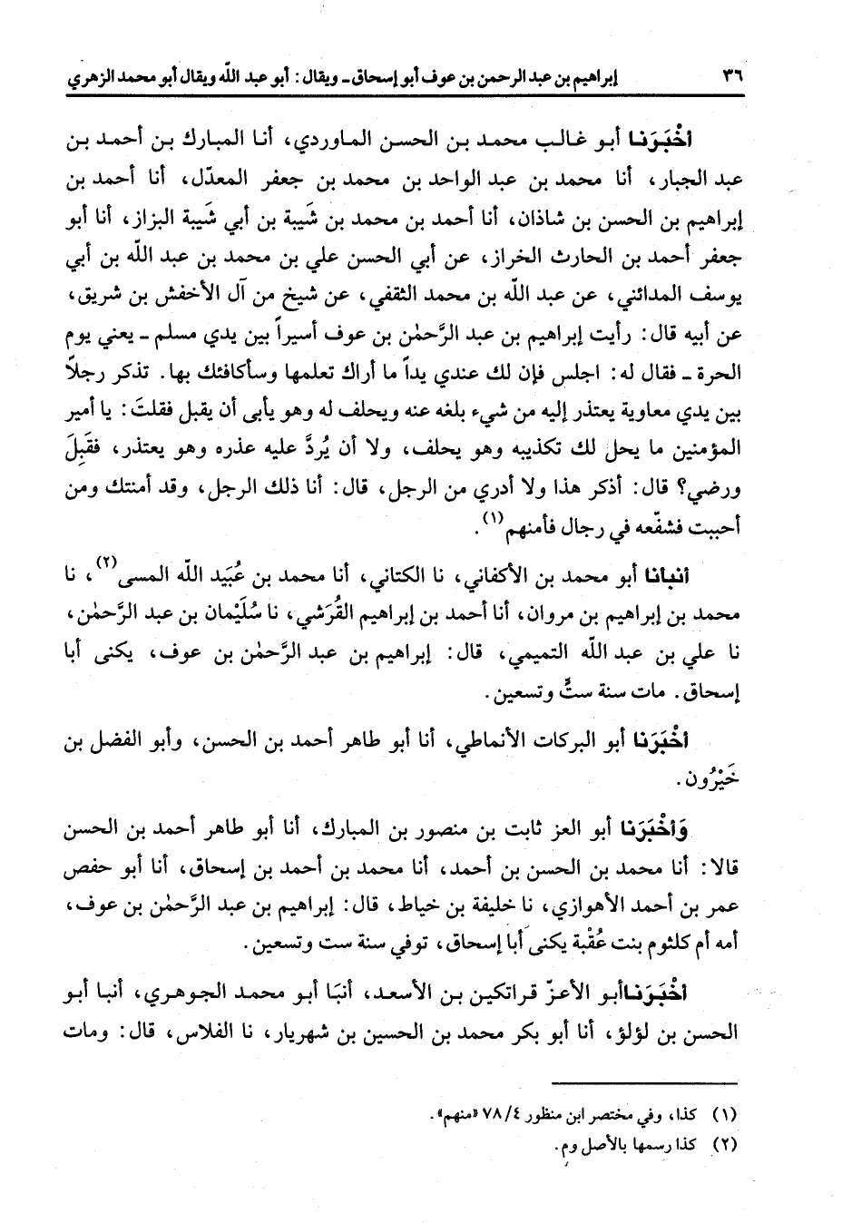 أخبرنا أبو غالب محمد بن الحسن الماوردي أنا المبارك بن أحمد بن عبد الجبار أنا محمد بن عبد الواحد بن محمد بن جعفر المعدل أنا أحمد بن إبراهيم بن الحسن بن شاذان أنا أحمد بن محمد بن شيبة بن أبي شيبة البزاز أنا أبو جعفر أحمد بن الحارث الخراز عن أبي الحسن علي بن محمد بن عبد الله بن أبي يوسف المدائني عن عبد الله بن محمد الثقفي عن شيخ من ال الأخفش بن شريق عن أبيه قال رأيت إبراهيم بن عبد الرحمن بن عوف أسيرا بين يدي مسلم يعني يوم الحرة فقال له اجلس فإن لك عندي يدا ما أراك تعلمها وسأكافئك بها تذكر رجلا بين يدي معاوية يعتذر إليه من شئ بلغه عنه ويحلف له وهو يأبي أن يقبل فقلت يا أمير المؤمنين ما يحل لك تكذيبه وهو يحلف ولا أن يرد عليه عذره وهو يعتذر فقبل ورضي قال أذكر هذا ولا أدري من الرجل قال أنا ذلك الرجل وقد أمنتك ومن أحببت فشفعه في رجال فأمنهم (1) أنبأنا أبو محمد بن الأكفاني نا الكتاني أنا محمد بن عبيد الله المسى (2) نا محمد بن إبراهيم بن مروان أنا أحمد بن إبراهيم القرشي نا سليمان بن عبد الرحمن نا علي بن عبد الله التميمي قال إبراهيم بن عبد الرحمن بن عوف يكنى أبا إسحاق مات سنة ست وتسعين أخبرنا أبو البركات الأنماطي أنا أبو طاهر أحمد بن الحسن وأبو الفضل بن خيرون وأخبرنا أبو العز ثابت بن منصور بن المبارك أنا أبو طاهر أحمد بن الحسن قالا أنا محمد بن الحسن بن أحمد أنا محمد بن أحمد بن إسحاق أنا أبو حفص عمر بن أحمد الأهوازي نا خليفة بن خياط قال إبراهيم بن عبد الرحمن بن عوف أمه أم كلثوم بنت عقبة يكنى أبا إسحاق توفي سنة ست وتسعين أخبرنا أبو الأعز قراتكين بن الأسعد أنبأ أبو محمد الجوهري أنبأ أبو الحسن بن لؤلؤ أنا أبو بكر محمد بن الحسين بن شهريار نا الفلاس قال ومات