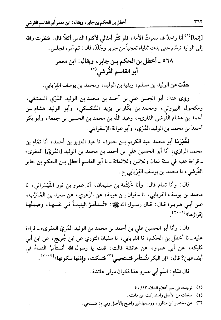 568 - أخطل بن الحكم بن جابر ويقال ابن معمر أبو القاسم القرشي (2) حدث عن الوليد بن مسلم وبقية بن الوليد ومحمد بن يوسف الفريابي روى عنه أبو الحسن علي بن أحمد بن محمد بن الوليد المري الدمشقي ومكحول البيروتي ومحمد بن بكار بن يزيد السكسكي وأبو الوليد هشام بن أحمد بن هشام القرشي القارئ وعبد الله بن محمد بن الحسين بن جمعة وأبو بكر أحمد بن محمد بن الوليد المري وأبو عوانة الإسفرايني أخبرنا أبو محمد عبد الكريم بن حمزة نا عبد العزيز بن أحمد أنا تمام بن محمد الرازي أنا أبو الحسين علي بن أحمد بن محمد بن الوليد المري المقرئ قراءة عليه في سنة ثمان وثلاثين وثلاثمائة نا أبو القاسم أخطل بن الحكم بن جابر القرشي نا محمد بن يوسف الفريابي قال وأنا تمام قال وأنا خيثمة بن سليمان أنا عمرو بن ثور القيسراني نا محمد بن يوسف الفريابي نا سفيان بن عيينة عن الزهري عن سعيد بن المسيب عن أبي هريرة قال قال رسول الله (صلى الله عليه وسلم) تستأمر اليتيمة في نفسها وصمتها إقرارها) قال وأنا أبو الحسين علي بن أحمد بن محمد بن الوليد المري المقرئ قراءة عليه نا أخطل بن الحكم نا الفريابي نا سفيان الثوري عن ابن جريح عن ابن أبي مليكة عن أبي عمرو عن عائشة قالت قلت يا رسول الله أتستأمر النساء في أبضاعهن قال (إن البكر لتستأمر فتستحيي (3) فتسكت وإذنها سكوتها) قال تمام اسم أبي عمرو هذا ذكوان مولى عائشة
