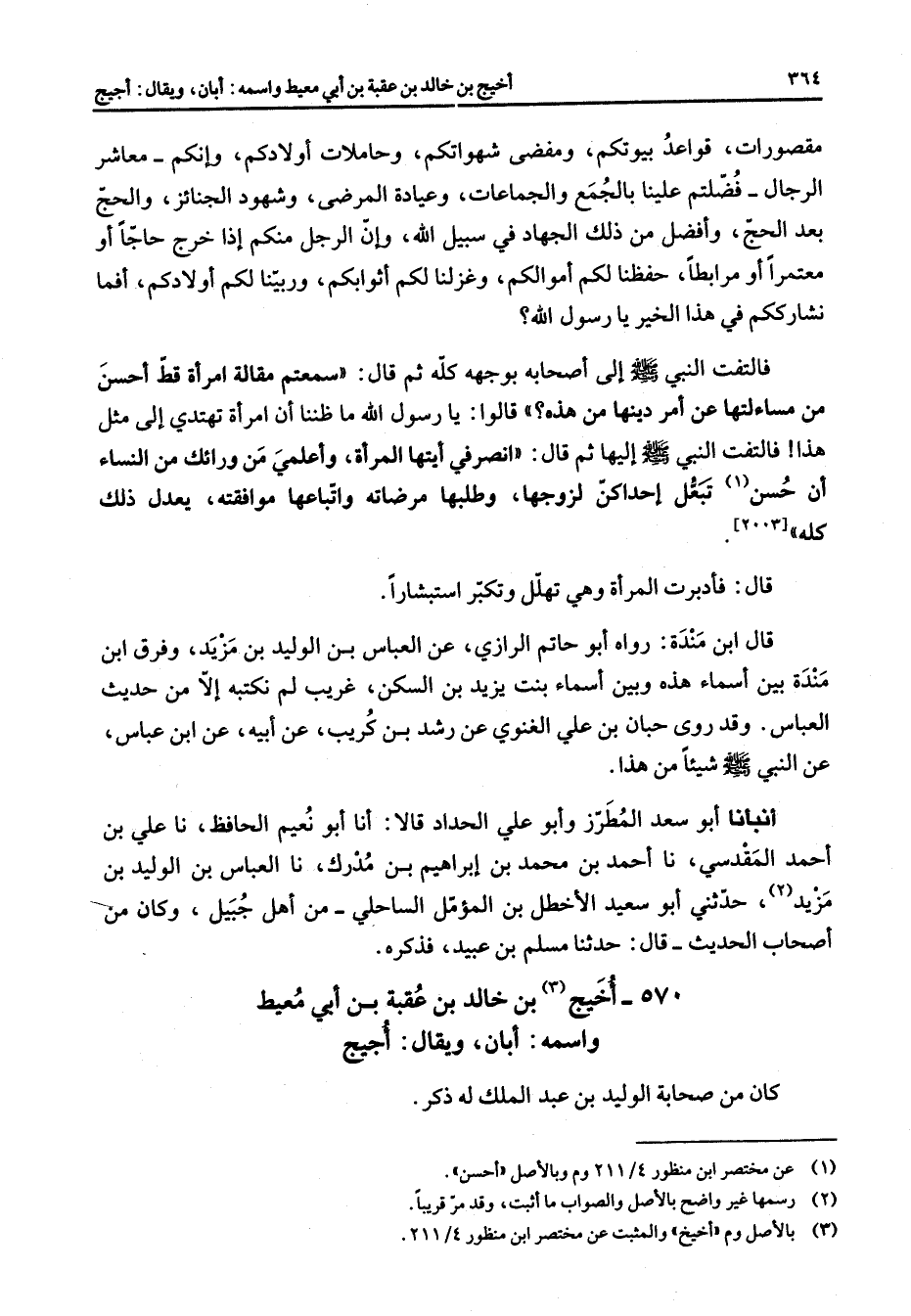 مقصورات قواعد بيوتكم ومفضى شهواتكم وحاملات أولادكم وإنكم معاشر الرجال فضلتم علينا بالجمع والجماعات وعيادة المرضى وشهود الجنائز والحج بعد الحج وأفضل من ذلك الجهاد في سبيل الله وإن الرجل منكم إذا خرج حاجا أو معتمرا أو مرابطا حفظنا لكم أموالكم وغزلنا لكم أثوابكم وربينا لكم أولادكم أفما نشارككم في هذا الخير يا رسول الله فالتفت النبي (صلى الله عليه وسلم) إلى أصحابه بوجهه كله ثم قال (سمعتم مقالة امرأة قط أحسن من مساءلتها عن أمر دينها من هذه) قالوا يا رسول الله ما ظننا أن امرأة تهتدي إلى مثل هذا فالتفت النبي (صلى الله عليه وسلم) إليها ثم قال (انصرفي أيتها المرأة واعلمي من ورائك من النساء أن حسن (1) تبعل إحداكن لزوجها وطلبها مرضاته واتباعها موافقته يعدل ذلك كله) قال فأدبرت المرأة وهي تهلل وتكبر استبشارا قال ابن مندة رواه أبو حاتم الرازي عن العباس بن الوليد بن مزيد وفرق ابن مندة بين أسماء هذه وبين أسماء بنت يزيد بن السكن غريب لم نكتبه إلا من حديث العباس وقد روى حبان بن علي الغنوي عن رشد بن كريب عن أبيه عن ابن عباس عن النبي (صلى الله عليه وسلم) شيئا من هذا أنبأنا أبو سعد المطرز وأبو علي الحداد قالا أنا أبو نعيم الحافظ نا علي بن أحمد المقدسي نا أحمد بن محمد بن إبراهيم بن مدرك نا العباس بن الوليد بن مزيد (2) حدثني أبو سعيد الأخطل بن المؤمل الساحلي من أهل جبيل وكان من أصحاب الحديث قال حدثنا مسلم بن عبيد فذكره