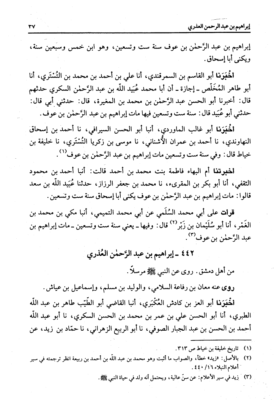 (3) زيد في سير الاعلام: عن سن عالية ويحتمل أنه ولد في حياة النبي صلى الله عليه وآله وسلم