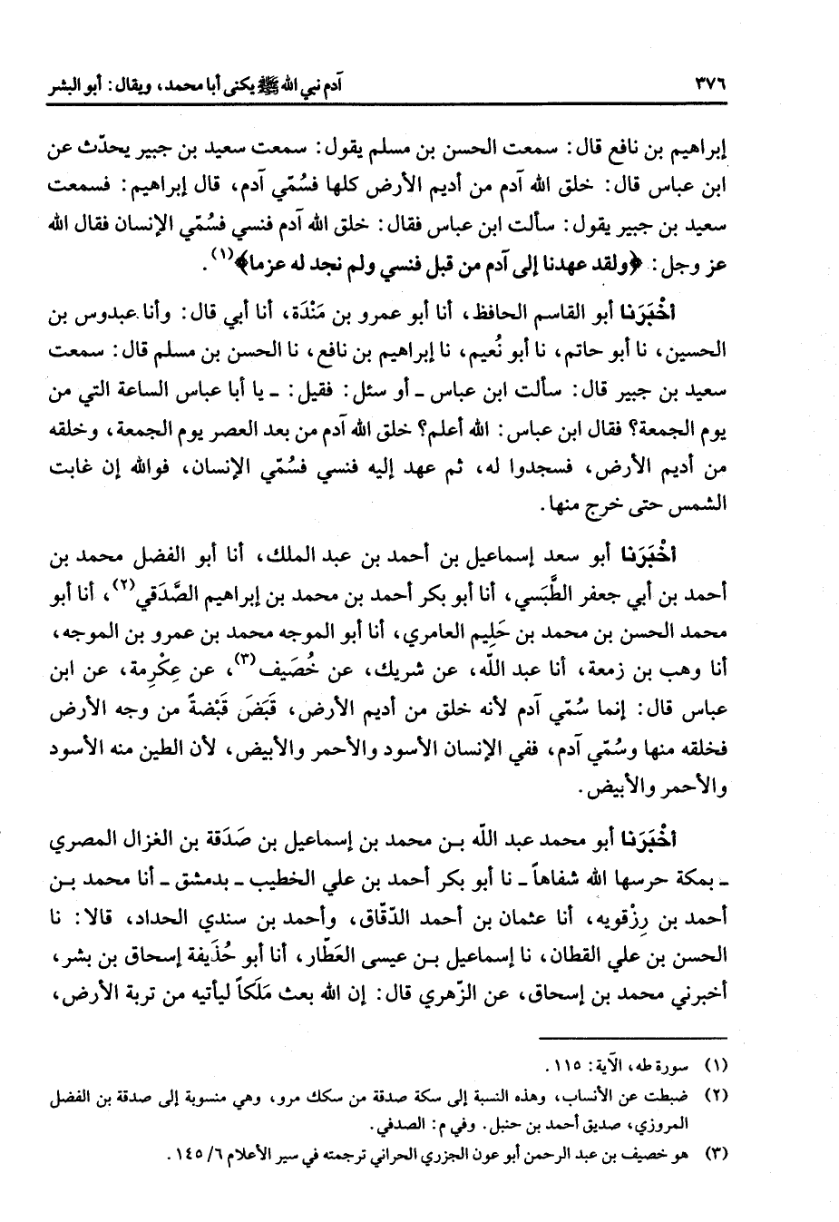 إبراهيم بن نافع قال سمعت الحسن بن مسلم يقول سمعت سعيد بن جبير يحدث عن ابن عباس قال خلق الله ادم من أديم الأرض كلها فسمي ادم قال إبراهيم فسمعت سعيد بن جبير يقول سألتابن عباس فقال خلق الله ادم فنسي فسمي الإنسان فقال الله عز وجل " ولقد عهدنا إلى ادم من قبل فنسي ولم نجد له عزما " (1) أخبرنا أبو القاسم الحافظ أنا أبو عمرو بن مندة أنا أبي قال وأنا عبدوس بن الحسين نا أبو حاتم نا أبو نعيم نا إبراهيم بن نافع نا الحسن بن مسلم قال سمعت سعيد بن جبير قال سألت ابن عباس أو سئل فقيل يا أبا عباس الساعة التي من يوم الجمعة فقال ابن عباس الله أعلم خلق الله ادم من بعد العصر يوم الجمعة وخلقه من أديم الأرض فسجدوا له ثم عهد إليه فنسي فسمي الإنسان فو الله إن غابت الشمس حتى خرج منها أخبرنا أبو سعد إسماعيل بن أحمد بن عبد الملك أنا أبو الفضل محمد بن أحمد بن أبي جعفر الطبسي أنا أبو بكر أحمد بن محمد بن إبراهيم الصدقي (2) أنا أبو محمد الحسن بن محمد بن حليم العامري أنا أبو الموجه محمد بن عمرو بن الموجه أنا وهب بن زمعة أنا عبد الله عن شريك عن خصيف (3) عن عكرمة عن ابن عباس قال إنما سمي ادم لأنه خلق من أديم الأرض قبض قبضة من وجه الأرض فخلقه منها وسمي ادم ففي الإنسان الأسود والأحمر والأبيض لأن الطين منه الأسود والأحمر والأبيض أخبرنا أبو محمد عبد الله بن محمد بن إسماعيل بن صدقة بن الغزال المصري بمكة حرسها الله شفاها نا أبو بكر أحمد بن علي الخطيب بدمشق أنا محمد بن أحمد بن رزقويه أنا عثمان بن أحمد الدقاق وأحمد بن سندي الحداد قالا نا الحسن بن علي القطان نا إسماعيل بن عيسى العطار أنا أبو حذيفة إسحاق بن بشر أخبرني محمد بن إسحاق عن الزهري قال إن الله بعث ملكا ليأتيه من تربة الأرض