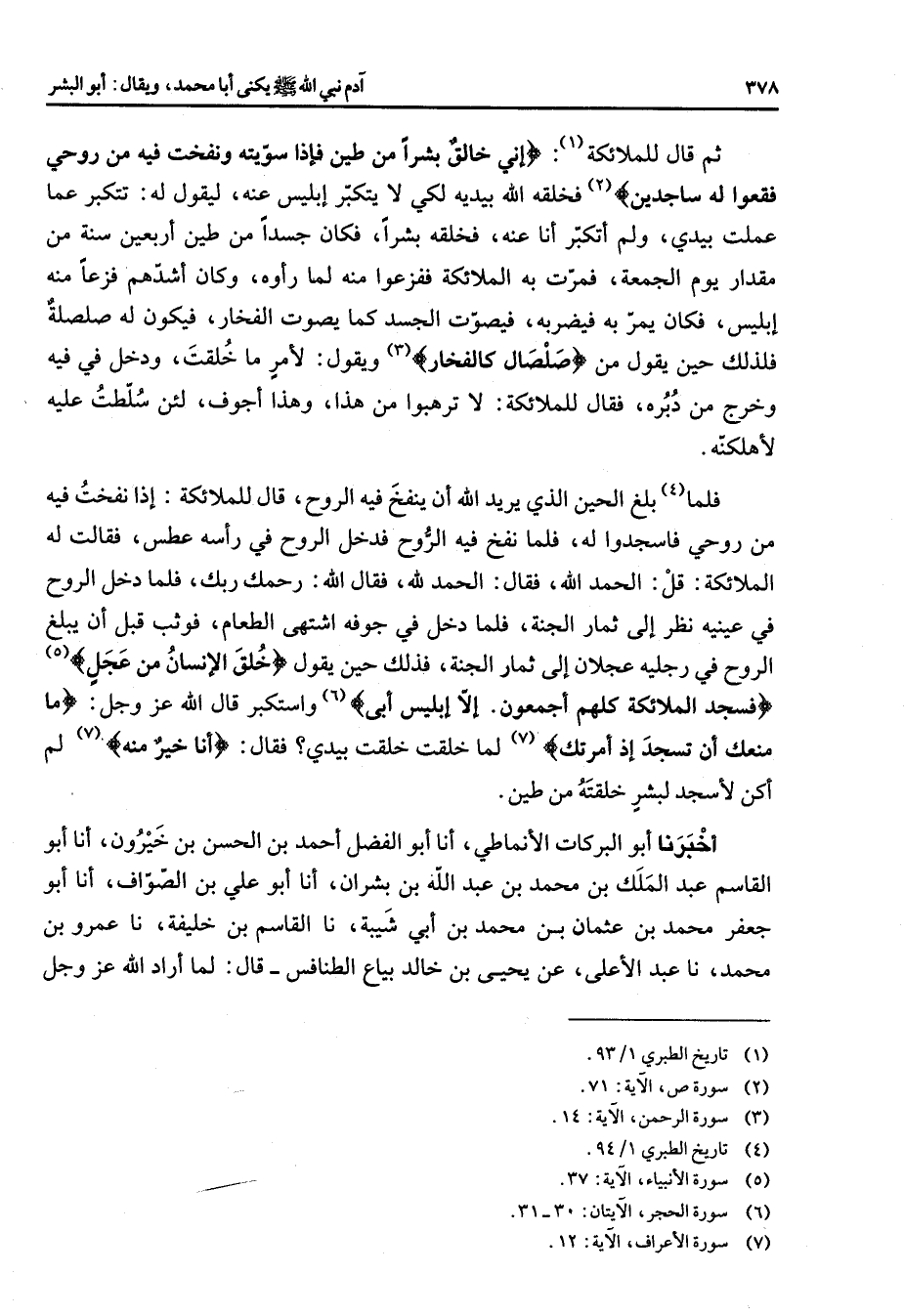 ثم قال للملائكة (1) " إني خالق بشرا من طين فإذا سويته ونفخت فيه من روحي فقعوا له ساجدين " (2) فخلقه الله بيديه لكي لا يتكبر إبليس عنه ليقول له تتكبر عما عملت بيدي ولم أتكبر أنا عنه فخلقه بشرا فكان جسدا من طين أربعين سنة من مقدار يوم الجمعة فمرت به الملائكة ففزعوا منه لما رأوه وكان أشدهم فزعا منه إبليس فكان يمر به فيضربه فيصوت الجسد كما يصوت الفخار فيكون له صلصلة فلذلك حين يقول من " صلصال كالفخار " (3) ويقول لأمر ما خلقت ودخل في فيه وخرج من دبره فقال للملائكة لا ترهبوا من هذا وهذا أجوف لئن سلطت عليه لأهلكنه فلما (4) بلغ الحين الذي يريد الله أن ينفخ فيه الروح قال للملائكة إذا نفخت فيه من روحي فاسجدوا له فلما نفخ فيه الروح فدخل الروح في رأسه عطس فقالت له الملائكة قل الحمد الله فقال الحمد لله فقال الله رحمك ربك فلما دخل الروح في عينيه نظر إلى ثمار الجنة فلما دخل في جوفه اشتهى الطعام فوثب قبل أن يبلغ الروح في رجليه عجلان إلى ثمار الجنة فذلك حين يقول " خلق الإنسان من عجل " (5) " فسجد الملائكة كلهم أجمعون إلا إبليس أبى " (6) واستكبر قال الله عز وجل " ما منعك أن تسجد إذ أمرتك " (7) لما خلقت حلقت بيدي فقال " أنا خير منه " (7) لم أكن لأسجد لبشر خلقته من طين أخبرنا أبو البركات الأنماطي أنا أبو الفضل أحمد بن الحسن بن خيرون أنا أبو القاسم عبد الملك بن محمد بن عبد الله بن بشران أنا أبو علي بن الصواف أنا أبو جعفر محمد بن عثمان بن محمد بن أبي شيبة نا القاسم بن خليفة نا عمرو بن محمد نا عبد الأعلى عن يحيى بن خالد بياع الطنافس قال لما أراد الله عز وجل
