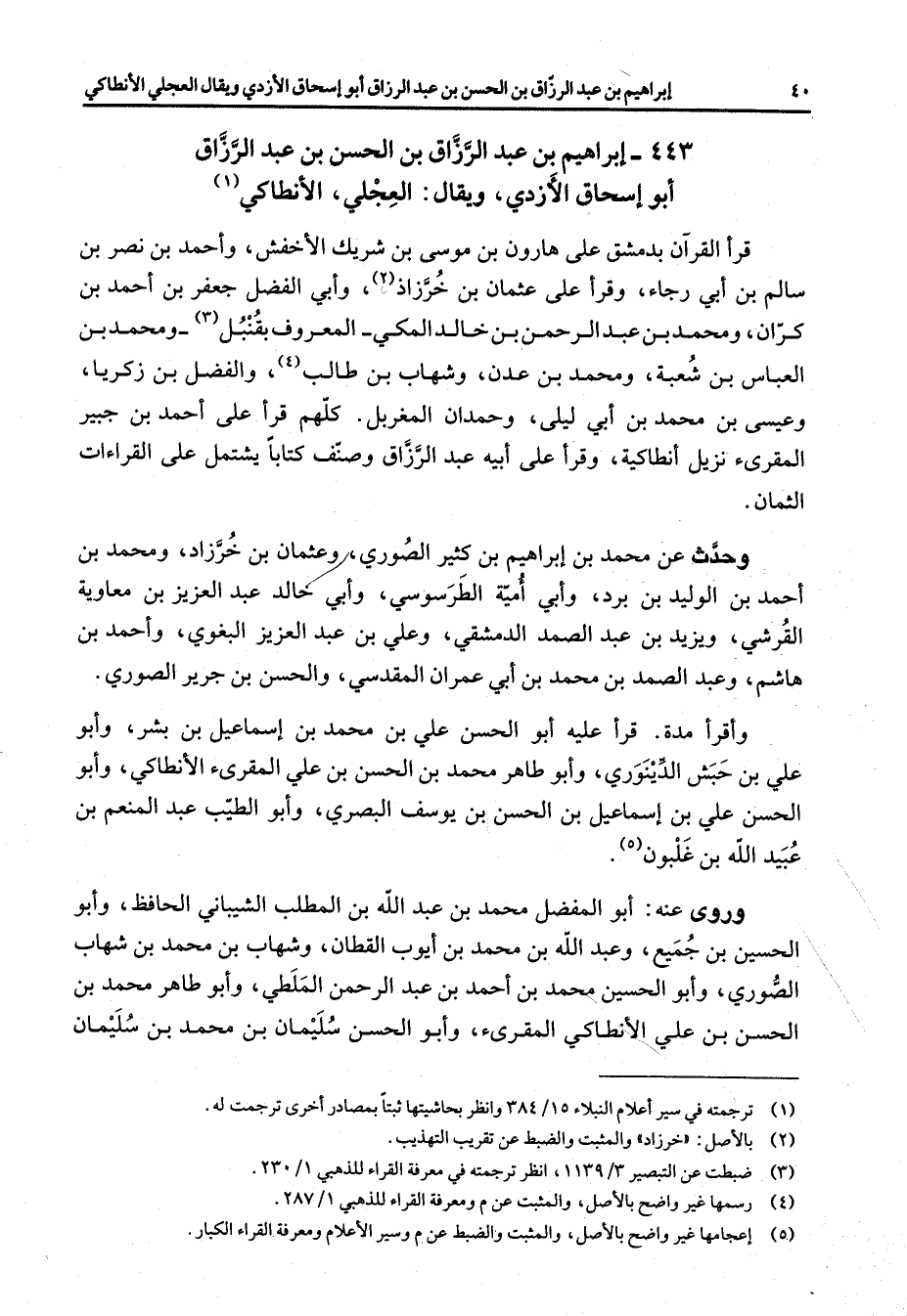 443 - إبراهيم بن عبد الرزاق بن الحسن بن عبد الرزاق أبو إسحاق الأزدي ويقال العجلي الأنطاكي (1) قرأ القرآن بدمشق على هارون بن موسى بن شريك الأخفش وأحمد بن نصر بن سالم بن أبي رجاء وقرأ على عثمان بن خرزاذ (2) وأبي الفضل جعفر بن أحمد بن كران ومحمد بن عبد الرحمن بن خالد المكي المعروف بقنبل (3) ومحمد بن العباس بن شعبة ومحمد بن عدن وشهاب بن طالب (4) والفضل بن زكريا وعيسى بن محمد بن أبي ليلى وحمدان المغربل كلهم قرأ على أحمد بن جبير المقرئ نزيل أنطاكية وقرأ على أبيه عبد الرزاق وصنف كتابا يشتمل على القراءات الثمان وحدث عن محمد بن إبراهيم بن كثير الصوري وعثمان بن خرزاد ومحمد بن أحمد بن الوليد بن برد وأبي أمية الطرسوسي وأبي خالد عبد العزيز بن معاوية القرشي ويزيد بن عبد الصمد الدمشقي وعلي بن عبد العزيز البغوي وأحمد بن هاشم وعبد الصمد بن محمد بن أبي عمران المقد سي والحسن بن جرير الصوري وأقرأ مدة قرأ عليه أبو الحسن علي بن محمد بن إسماعيل بن بشر وأبو علي بن حبش الدينوري وأبو طاهر محمد بن الحسن بن علي المقرئ الأنطاكي وأبو الحسن علي بن إسماعيل بن الحسن بن يوسف البصري وأبو الطيب عبد المنعم بن عبيد الله بن غلبون (5) وروى عنه أبو المفضل محمد بن عبد الله بن المطلب الشيباني الحافظ وأبو الحسين بن جميع وعبد الله بن محمد بن أيوب القطان وشهاب بن محمد بن شهاب الصوري وأبو الحسين محمد بن أحمد بن عبد الرحمن الملطي وأبو طاهر محمد بن الحسن بن علي الأنطاكي المقرئ وأبو الحسن سليمان بن محمد بن سليمان