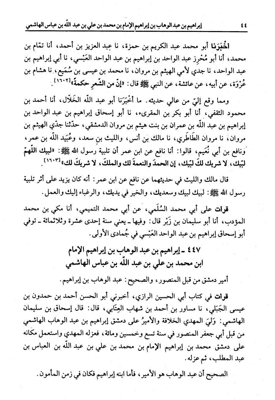 447 - إبراهيم بن عبد الوهاب بن إبراهيم الإمام ابن محمد بن علي بن عبد الله بن عباس الهاشمي أمير دمشق من قبل المنصور والصحيح عبد الوهاب بن إبراهيم قرأت في كتاب أبي الحسين الرازي أخبرني أبو الحسن أحمد بن حمدون بن عيسى الجبلي نا مساور بن أحمد بن شهاب العتابي قال قال إسحاق بن سليمان الهاشمي ولي المهدي الخلافة والأمير على دمشق إبراهيم بن عبد الوهاب الهاشمي من قبل أبي جعفر المنصور في سنة تسع وخمسين ومائة فعزله المهدي واستعمل مكانه على دمشق محمد بن إبراهيم الإمام بن محمد بن علي بن عبد الله بن العباس بن عبد المطلب ثم عزله الصحيح أن عبد الوهاب هو الأمير فأما ابنه إبراهيم فكان في زمن المأمون