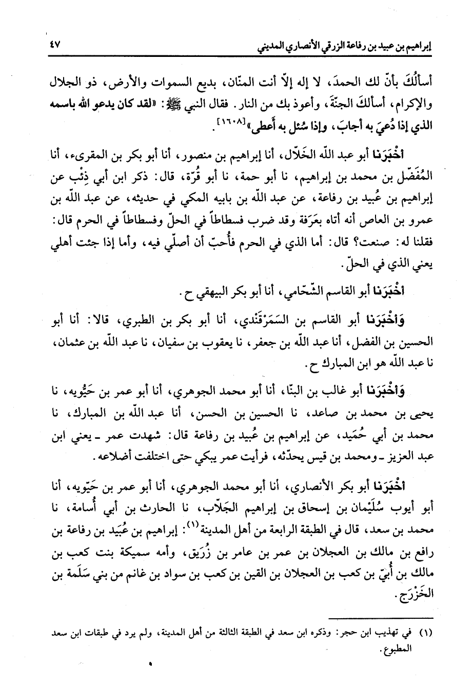 أسألك بأن لك الحمد لا إله إلا أنت المنان بديع السموات والأرض ذو الجلال والإكرام أسألك الجنة وأعوذ بك من النار فقال النبي (صلى الله عليه وسلم) لقد كان يدعو الله باسمه الذي إذا دعي به أجاب وإذا سئل به أعطى) أخبرنا أبو عبد الله الخلال أنا إبراهيم بن منصور أنا أبو بكر بن المقرئ أنا المفضل بن محمد بن إبراهيم نا أبو حمة نا أبو قرة قال ذكر ابن أبي ذئب عن إبراهيم بن عبيد بن رفاعة عن عبد الله بن بابيه المكي في حديثه عن عبد الله بن عمرو بن العاص أنه أتاه بعرفة وقد ضرب فسطاطا في الحل وفسطاطا في الحرم قال فقلنا له صنعت قال أما الذي في الحرم فأحب أن أصلي فيه وأما إذا جئت أهلي يعني الذي في الحل أخبرنا أبو القاسم الشحامي أنا أبو بكر البيهقي وأخبرنا أبو القاسم بن السمرقندي أنا أبو بكر بن الطبري قالا أنا أبو الحسين بن الفضل أنا عبد الله بن جعفر نا يعقوب بن سفيان نا عبد الله بن عثمان نا عبد الله هو ابن المبارك وأخبرنا أبو غالب بن البنا أنا أبو محمد الجوهري أنا أبو عمر بن حيويه نا يحيى بن محمد بن صاعد نا الحسين بن الحسن أنا عبد الله بن المبارك نا محمد بن أبي حميد عن إبراهيم بن عبيد بن رفاعة قال شهدت عمر يعني ابن عبد العزيز ومحمد بن قيس يحدثه فرأيت عمر يبكي حتى اختلفت أضلاعه أخبرنا أبو بكر الأنصاري أنا أبو محمد الجوهري أنا أبو عمر بن حيويه أنا أبو أيوب سليمان بن إسحاق بن إبراهيم الجلاب نا الحارث بن أبي أسامة نا محمد بن سعد قال في الطبقة الرابعة من أهل المدينة (1) إبراهيم بن عبيد بن رفاعة بن رافع بن مالك بن العجلان بن عمر بن عامر بن زريق وأمه سميكة بنت كعب بن مالك بن أبي بن كعب بن العجلان بن القين بن كعب بن سواد بن غانم من بني سلمة بن الخزرج
