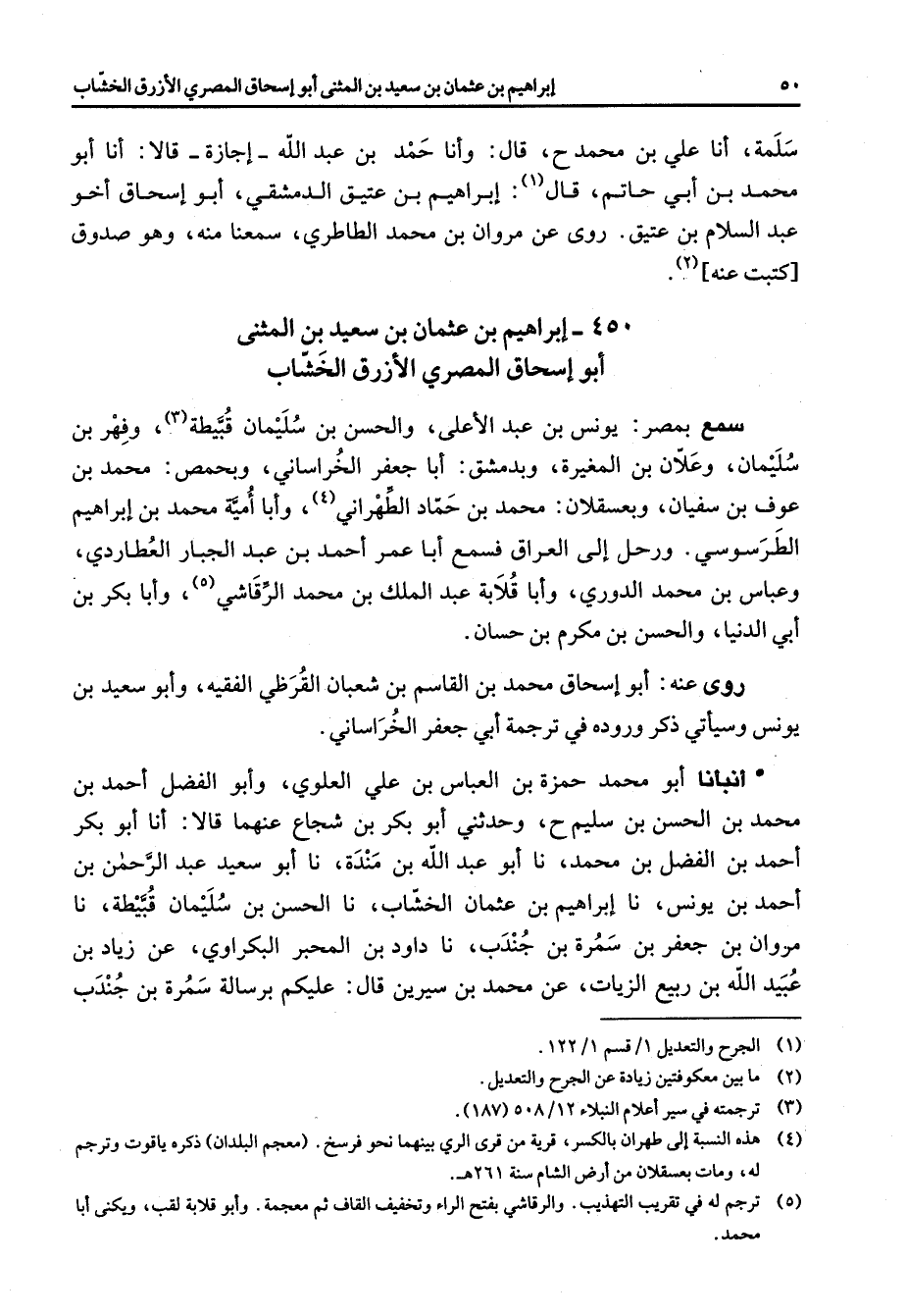 450 - إبراهيم بن عثمان بن سعيد بن المثنى أبو إسحاق المصري الأزرق الخشاب سمع بمصر يونس بن عبد الأعلى والحسن بن سليمان قبيطة (3) وفهر بن سليمان وعلان بن المغيرة وبدمشق أبا جعفر الخراساني وبحمص محمد بن عوف بن سفيان وبعسقلان محمد بن حماد الطهراني (4) وأبا أمية محمد بن إبراهيم الطرسوسي ورحل إلى العراق فسمع أبا عمر أحمد بن عبد الجبار العطاردي وعباس بن محمد الدوري وأبا قلابة عبد الملك بن محمد الرقاشي (5) وأبا بكر بن أبي الدنيا والحسن بن مكرم بن حسان روى عنه أبو إسحاق محمد بن القاسم بن شعبان القرظي الفقيه وأبو سعيد بن يونس وسيأتي ذكر وروده في ترجمة أبي جعفر الخراساني أنبأنا أبو محمد حمزة بن العباس بن علي العلوي وأبو الفضل أحمد بن محمد بن الحسن بن سليم وحدثني أبو بكر بن شجاع عنهما قالا أنا أبو بكر أحمد بن الفضل بن محمد نا أبو عبد الله بن مندة نا أبو سعيد عبد الرحمن بن أحمد بن يونس نا إبراهيم بن عثمان الخشاب نا الحسن بن سليمان قبيطة نا مروان بن جعفر بن سمرة بن جندب نا داود بن المحبر البكراوي عن زياد بن عبيد الله بن ربيع الزيات عن محمد بن سيرين قال عليكم برسالة سمرة بن جندب