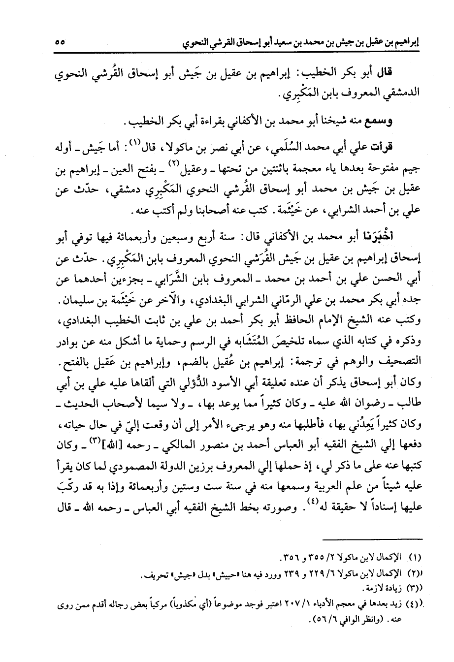 قال أبو بكر الخطيب إبراهيم بن عقيل بن جيش أبو إسحاق القرشي النحوي الدمشقي المعروف بابن المكبري وسمع منه شيخنا أبو محمد بن الأكفاني بقراءة أبي بكر الخطيب قرأت علي أبي محمد السلمي عن أبي نصر بن ماكولا قال (1) أما جيش أوله جيم مفتوحه بعدها ياء معجمة باثنتين من تحتها وعقيل (2) بفتح العين إبراهيم بن عقيل بن جيش بن محمد أبو إسحاق القرشي النحوي المكبري دمشقي حدث عن علي بن أحمد الشرابي عن خيثمة كتب عنه أصحابنا ولم أكتب عنه أخبرنا أبو محمد بن الأكفاني قال سنة أربع وسبعين وأربعمائة فيها توفي أبو إسحاق إبراهيم بن عقيل بن جيش القرشي النحوي المعروف بابن المكبري حدث عن أبي الحسن علي بن أحمد بن محمد المعروف بابن الشرابي بجزءين أحدهما عن جده أبي بكر محمد بن علي الرماني الشرابي البغدادي والاخر عن خيثمة بن سليمان وكتب عنه الشيخ الإمام الحافظ أبو بكر أحمد بن علي بن ثابت الخطيب البغدادي وذكره في كتابه الذي سماه تلخيص المتشابه في الرسم وحماية ما أشكل منه عن بوادر التصحيف والوهم في ترجمة إبراهيم بن عقيل بالضم وإبراهيم بن عقيل بالفتح وكان أبو إسحاق يذكر أن عنده تعليقة أبي الأسود الدؤلي التي ألقاها عليه علي بن أبي طالب رضوان الله عليه وكان كثيرا مما يوعد بها ولا سيما لأصحاب الحديث وكان كثيرا يعدني بها فأطلبها منه وهو يرجئ الأمر إلى أن وقعت إلي في حال حياته دفعها إلي الشيخ الفقيه أبو العباس أحمد بن منصور المالكي رحمه الله (3) وكان كتبها عنه على ما ذكر لي إذ حملها إلي المعروف برزين الدولة المصمودي لما كان يقرأ عليه شيئا من علم العربية وسمعها منه في سنة ست وستين وأربعمائة وإذا به قد ركب عليها إسنادا لا حقيقة له (4) وصورته بخط الشيخ الفقيه أبي العباس رحمه الله قال