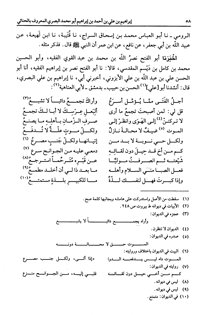 الرومي نا أبو العباس محمد بن إسحاق السراج نا قتيبة نا ابن لهيعة عن عبيد الله بن أبي جعفر عن نافع عن ابن عمر أن النبي (صلى الله عليه وسلم) قال فذكر مثله أخبرنا أبو الفتح نصر الله بن محمد بن عبد القوي الفقيه وأبو الحسين محمد بن كامل بن ديسم المقدسي قالا نا أبو الفتح نصر بن إبراهيم الفقيه أنا أبو الحسن علي بن عبد الله بن علي الأبزوني أخبرني أبي نا إبراهيم بن علي البصري قال أنشدنا أبو علي (1) الحسن بن حبيب بدمشق لأبي العتاهية (2) أجل الفتى مما يؤمل أسرع * وأراك تجمع دائبا لا تشبع (3) قل لي لمن أصبحت تجمع ما أرى * البعل عرسك لا أبالك تجمع لا تركنن (4) إلى الهوى وانظر إلى * صرف الزمان بأهله ما يصنع الموت (5) ضيف لا محالة نازل * ولكل موت علة لا تدفع ولكل حي نوبة لا بد من * إتيانها ولكل جنب مصرع (6) كم من أخ قد حيل دون لقائه * دمعي عليه من الجوانح سرع (7) شيعته ثم انصرفت موليا * عن قبره مترحما استرجع (8) فعل الصبا مني السلام وأهله * ما بعد ذا لي أن أخلد مطمع (9) وإذا كبرت فهل لنفسك لذة * ما للكبير بلذة مستمتع (10)