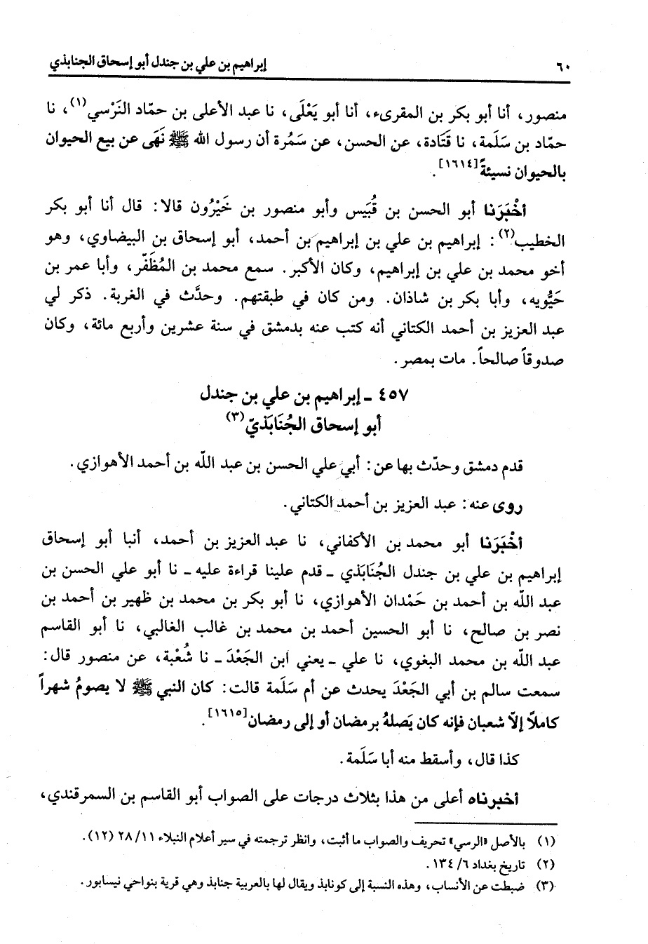 457 - إبراهيم بن علي بن جندل أبو إسحاق الجنابذي (3) قدم دمشق وحدث بها عن أبي علي الحسن بن عبد الله بن أحمد الأهوازي روى عنه عبد العزيز بن أحمد الكتاني أخبرنا أبو محمد بن الأكفاني نا عبد العزيز بن أحمد أنبا أبو إسحاق إبراهيم بن علي بن جندل الجنابذي قدم علينا قراءة عليه نا أبو علي الحسن بن عبد الله بن أحمد بن حمدان الأهوازي نا أبو بكر بن محمد بن ظهير بن أحمد بن نصر بن صالح نا أبو الحسين أحمد بن محمد بن غالب الغالبي نا أبو القاسم عبد الله بن محمد البغوي نا علي يعني ابن الجعد نا شعبة عن منصور قال سمعت سالم بن أبي الجعد يحدث عن أم سلمة قالت كان النبي (صلى الله عليه وسلم) لا يصوم شهر كاملا إلا شعبان فإنه كان يصله برمضان أو إلى رمضان كذا قال وأسقط منه أبا سلمة أخبرناه أعلى من هذا بثلاث درجات على الصواب أبو القاسم بن السمرقندي