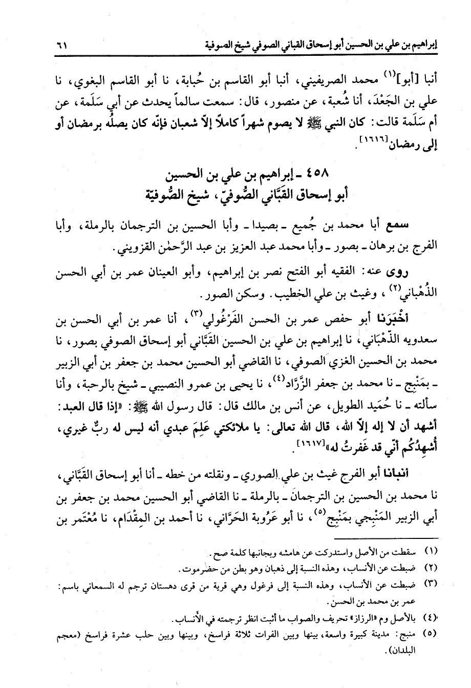 458 - إبراهيم بن علي بن الحسين أبو إسحاق القباني الصوفي شيخ الصوفية سمع أبا محمد بن جميع بصيدا وأبا الحسين بن الترجمان بالرملة وأبا الفرج بن برهان بصور وأبا محمد عبد العزيز بن عبد الرحمن القزويني روى عنه الفقيه أبو الفتح نصر بن إبراهيم وأبو العينان عمر بن أبي الحسن الذهباني (2) وغيث بن علي الخطيب وسكن الصور أخبرنا أبو حفص عمر بن الحسن الفرغولي (3) أنا عمر بن أبي الحسن بن سعدويه الذهباني نا إبراهيم بن علي بن الحسين القباني أبو إسحاق الصوفي بصور نا محمد بن الحسين الغزي الصوفي نا القاضي أبو الحسين محمد بن جعفر بن أبي الزبير بمنبج نا محمد بن جعفر الزراد (4) نا يحيى بن عمرو النصيبي شيخ بالرحبة وأنا سألته نا حميد الطويل عن أنس بن مالك قال رسول الله (صلى الله عليه وسلم) (إذا قال العبد أشهد أن لا إله إلا الله قال الله تعالى يا ملائكتي علم عبدي أنه ليس له رب غيري أشهدكم أني قد غفرت له) أنبأنا أبو الفرج غيث بن علي الصوري ونقلته من خطه أنا أبو إسحاق القباني نا محمد بن الحسين بن الترجمان بالرملة نا القاضي أبو الحسين محمد بن جعفر بن أبي الزبير المنبجي بمنبج (5) نا أبو عروبة الحراني نا أحمد بن المقدام نا معتمر بن