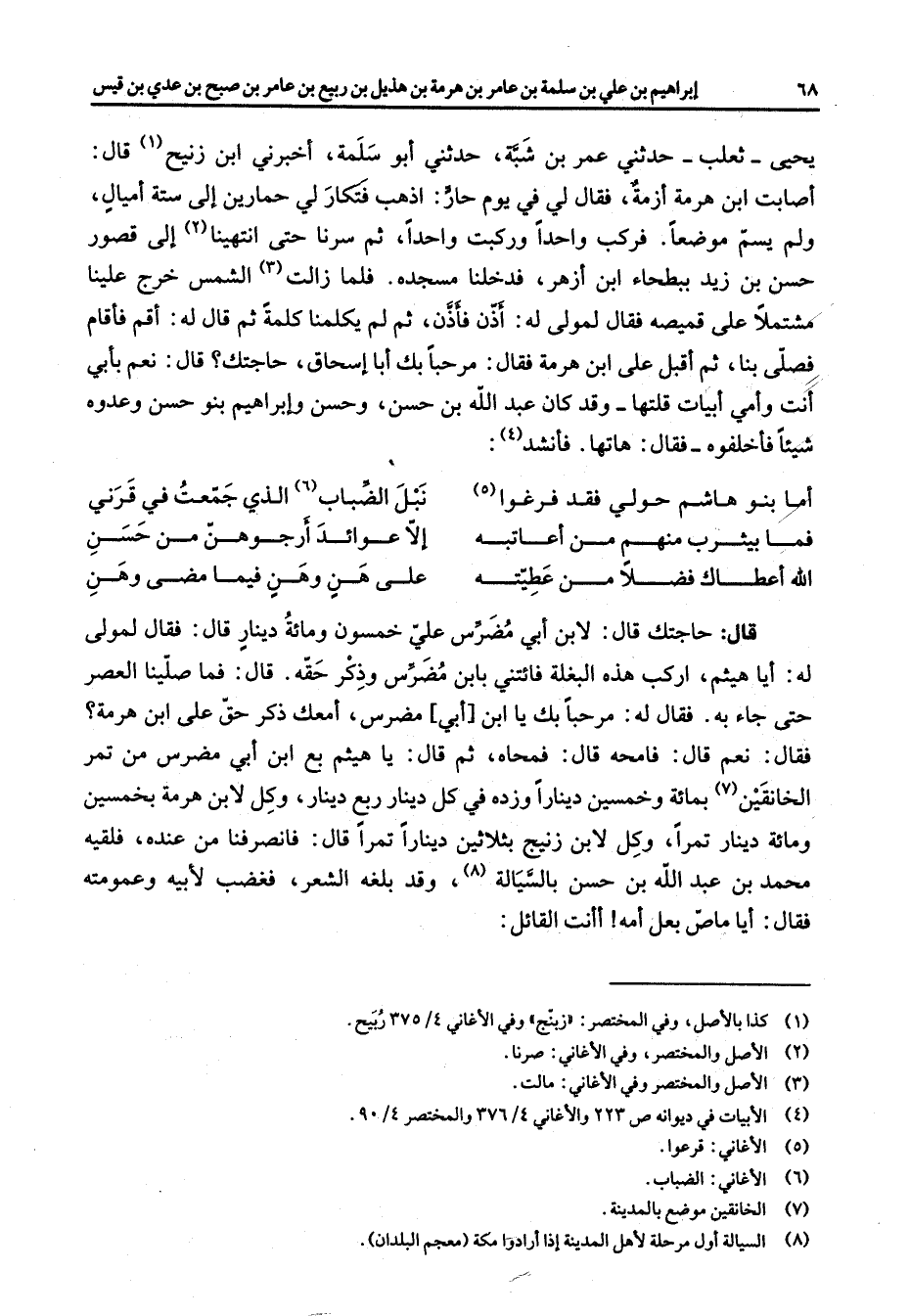 يحيى ثعلب حدثني عمر بن شبة حدثني أبو سلمة أخبرني ابن زنيح (1) قال أصابت ابن هرمة أزمة فقال لي في يوم حار اذهب فتكار لي حمارين إلى ستة أميال ولم يسم موضعا فركب واحدا وركبت واحدا ثم سرنا حتى انتهينا (2) إلي قصور حسن بن زيد ببطحاء ابن أزهر فدخلنا مسجده فلما زالت (3) الشمس خرج علينا مشتملا على قميصه فقال لمولى له أذن فأذن ثم لم يكلمنا كلمة ثم قال له أقم فأقام فصلى بنا ثم أقبل على ابن هرمة فقال مرحبا بك أبا إسحاق حاجتك قال نعم بأبي أنت وأمي أبيات قلتها وقد كان عبد الله بن حسن وحسن وإبراهيم بنو حسن وعدوه شيئا فأخلفوه فقال هاتها فأنشد (4) أما بنو هاشم حولي فقد فرغوا (5) * نبل الضباب (6) الذي جمعت في قرني فما بيثرب منهم من أعاتبه * إلا عوائد أرجوهن من حسن الله أعطاك فضلا من عطيته * على هن وهن فيما مضى وهن * قال حاجتك قال لابن أبي مضرس علي خمسون ومائة دينار قال فقال لمولى له أيا هيثم اركب هذه البغلة فائتني بابن مضرس وذكر حقه قال فما صلينا العصر حتى جاء به فقال له مرحبا بك يا ابن أبي مضرس أمعك ذكر حق على ابن هرمة فقال نعم قال فامحه قال فمحاه ثم قال يا هيثم بع ابن أبي مضرس من تمر الخانقين (7) بمائة وخمسين دينارا وزده في كل دينار ربع دينار وكل لابن هرمة بخمسين ومائة دينار تمرا وكل لابن زنيج بثلاثين دينارا تمرا قال فانصرفنا من عنده فلقيه محمد بن عبد الله بن حسن بالسيالة (8) وقد بلغه الشعر فغضب لأبيه وعمومته فقال أيا ماص بعل أمه أأنت القائل