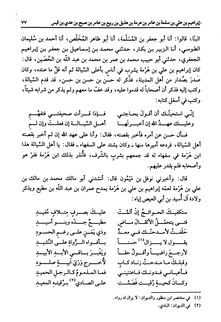 البنا قالوا أنا أبو جعفر بن المسلمة أنا أبو طاهر المخلص أنا أحمد بن سليمان الطوسي أنا الزبير بن بكار حدثني محمد بن إسماعيل بن جعفر بن إبراهيم الجعفري حدثني أبو حبيب محمد بن عمر بن محمد بن عبد الله بن الحصين قال كان إبراهيم بن علي بن هرمة يشرب في أناس بأعلى السيالة ثم أنه قل ما عنده وكان صدر بصدار من أهل المدينة فذكر له حسن بن حسن بن حسن قد قدم السيالة وكتب إليه فذكر أن أصحابا له قدموا عليه وقد خف ما معهم ولم يذكر من شرابه شيئا وكتب في أسفل كتابه إني استحيتك أن أقول بحاجتي * فإذا قرأت صحيفتي فتفهم وعليك عهد الله إن أخبرتها * أهل السيالة إن فعلت وإن لم * فسأل حسن عن أمره فأخبر بقصته فقال وأنا على عهد الله إن لم أخبر بقصته أهل السيالة فردعه أميرها منها وكان يشتد على السفهاء فقال يا أهل السيالة هذا ابن هرمة في سفهاء له قد جمعهم بشرب بالشرف فأنذر بذلك ابن هرمة ففر هو وأصحابه فلم يقدر عليهم قال وأخبرني نوفل بن ميمون قال أنشدني أبو مالك محمد بن مالك بن علي بن هرمة لعمه إبراهيم بن علي بن هرمة يمدح عمران بن عبد الله بن مطيع ويذكر ولادة آل أسيد بن أبي العيص إياه ستكفيك الحوائج إن ألمت * عليك بصرف متلاف مفيد فتى يتحمل الأثقال ماض * مطيع جده وبنو أسيد حلفت لأمدحنك في معد * وذي يمن على رغم الحسود يقول لا يزال (1) حسنا * بأفواه الرواة على النشيد لأرجع راضيا وأقول حقا * ويغبر باقي الأبد الأبيد * وقبلك ما مدحت زناد كاب * لأخرج وري ابية صلود فأعياني فدونك فاعتنيني * فما المذموم كالرجل الحميد وكان كحية رقيت فصمت * على الصادي (2) برقيته المعيد