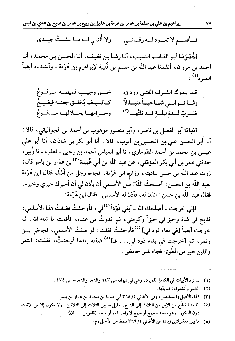 فأقسم لا تعود له رقائي * ولا أثنى له ما عشت جيدي أخبرنا أبو القاسم النسيب أنا رشأ بن نظيف أنا الحسن بن محمد أنا أحمد بن مروان أنشدنا عبد الله بن مسلم بن قتيبة لإبراهيم بن هرمة وأنشدناه أيضا المبرد (1) قد يدرك الشرف الفتى ورداؤه * خلق وجيب قميصه مرقوع إما تراني شاحبا متبذلا * كالسيف يخلق جفنه فيطيع فلرب لذة ليلة قد نلتها (2) وحرامها بحلالها مدفوع * أنبأنا أبو الفضل بن ناصر وأبو منصور موهوب بن أحمد بن الجواليقي قالا أنا أبو الحسن علي بن الحسين بن أيوب قالا أنا أبو بكر بن شاذان أنا أبو علي عيسى بن محمد بن أحمد الطوماري نا أبو العباس أحمد بن يحيى ثعلب نا زبير حدثني عمر بن أبي بكر المؤملي عن عبد الله بن أبي عبيدة (3) بن عمار بن ياسر قال زرت عبد الله بن حسن بباديتة وزاره ابن هرمة فجاءه رجل من أسلم فقال ابن هرمة لعبد الله بن الحسن أصلحك الله سل الأسلمي أن يأذن لي أن أخبرك خبري وخبره فقال عبد الله بن حسن ائذن له فأذن له الأسلمي فقال ابن هرمة فإني خرجت أصلحك الله أبغي ذودا (4) لي فأوحشت فضفت هذا الأسلمي فذبح لي شاة وخبز لي خبزا وأكرمني ثم غدوت من عنده فأقمت ما شاء الله ثم خرجت أيضا في بغاء ذود لي (5) فأوحشت فقلت لو ضفت الأسلمي فجاءني بلبن وتمر ثم خرجت في بغاء ذود لي ف (5) ضفته بعدما أوحشت فقلت التمر واللبن خير من الطوى فجاء بلبن حامض