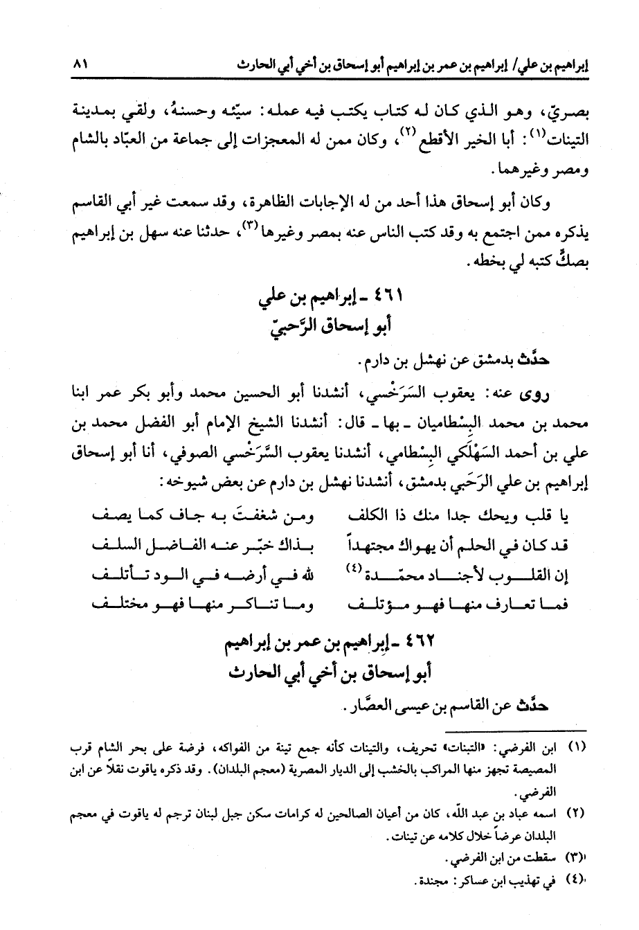 461 - إبراهيم بن علي أبو إسحاق الرحبي حدث بدمشق عن نهشل بن دارم روى عنه يعقوب السرخسي أنشدنا أبو الحسين محمد وأبو بكر عمر ابنا محمد بن محمد البسطاميان بها قال أنشدنا الشيخ الإمام أبو الفضل محمد بن علي بن أحمد السهلكي البسطامي أنشدنا يعقوب السرخسي الصوفي أنا أبو إسحاق إبراهيم بن علي الرحبي بدمشق أنشدنا نهشل بن دارم عن بعض شيوخه يا قلب ويحك جدا منك ذا الكلف * ومن شغفت به جاف كما يصف قد كان في الحلم أن يهواك مجتهدا * بذاك خبر عنه الفاضل السلف إن القلوب لأجناد محمدة (4) * لله في أرضه في الود تأتلف فما تعارف منها فهو مؤتلف * وما تناكر منها فهو مختلف *