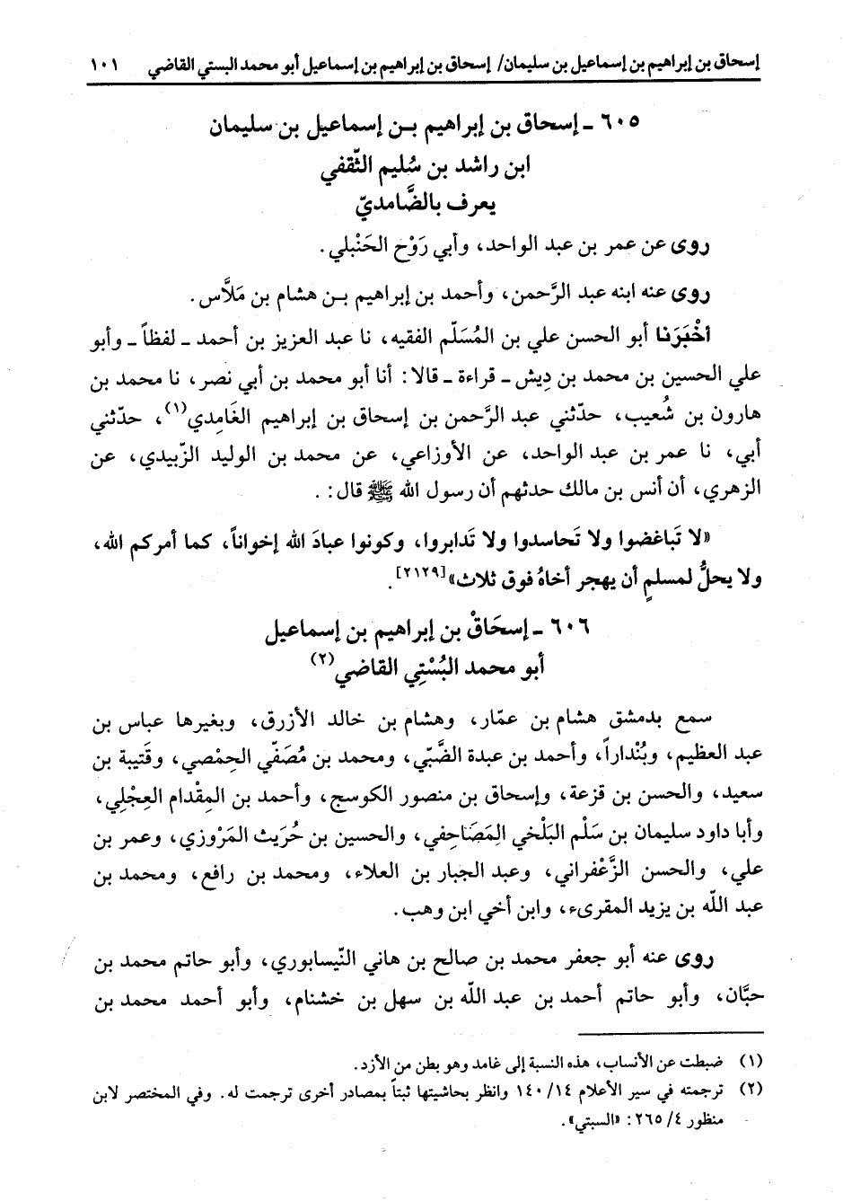 605 - إسحاق بن إبراهيم بن إسماعيل بن سليمان ابن راشد بن سليم الثقفي يعرف بالضامدي روى عن عمر بن عبد الواحد وأبي روح الحنبلي روى عنه ابنه عبد الرحمن وأحمد بن إبراهيم بن هشام بن ملاس أخبرنا أبو الحسن علي بن المسلم الفقيه نا عبد العزيز أحمد لفظا وأبو علي الحسين بن محمد بن ديش قراءة قالا أنا أبو محمد أبي نصر نا محمد بن هارون بن شعيب حدثني عبد الرحمن بن إسحاق بن إبراهيم الغامدي (1) حدثني أبي نا عمر بن عبد الواحد عن الأوزاعي عن محمد بن الوليد الزبيدي عن الزهري أن أنس بن مالك حدثهم أن رسول الله (صلى الله عليه وسلم) قال لا تباغضوا ولا تحاسدوا وتدابروا وكونوا عباد الله إخوانا كما أمركم الله ولا يحل لمسلم أن يهجر أخاه فوق ثلاث