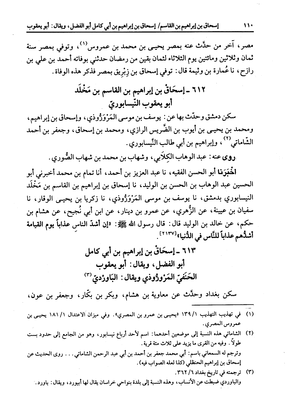 613 - إسحاق بن إبراهيم بن أبي كامل أبو الفضل ويقال أبو يعقوب الحنفي المروروذي ويقال الباوردي (3) سكن بغداد وحدث عن معاوية بن هشام وبكر بن بكار وجعفر بن عون