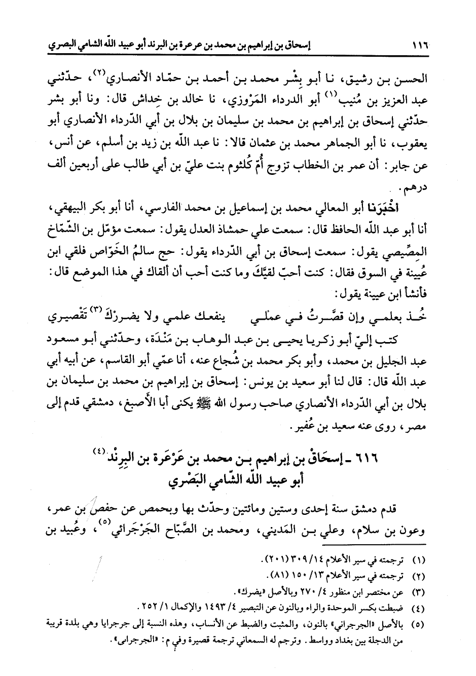 616 - إسحاق بن إبراهيم بن محمد بن عرعرة بن البرند (4) أبو عبيد الله الشامي البصري قدم دمشق سنة إحدى وستين ومائتين وحدث بها وبحمص عن حفص بن عمر وعون بن سلام وعلي بن المديني ومحمد بن الصباح الجرجرائي (5) وعبيد بن