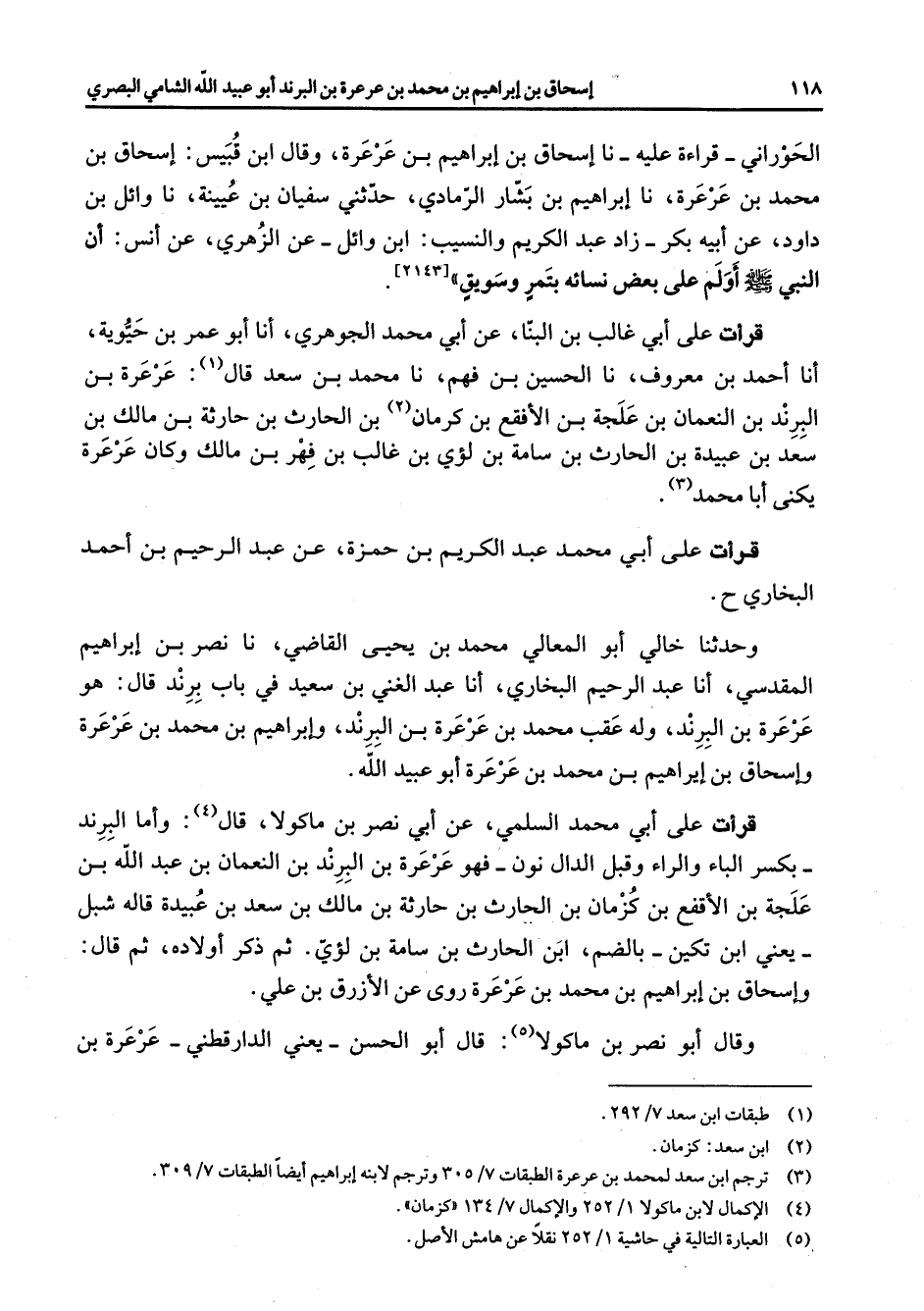 [2143] قرأت على أبي غالب بن البنا عن أبي محمد الجوهري أنا أبو عمر بن حيوية أنا أحمد بن معروف نا الحسين بن فهم نا محمد بن سعد قال (1) عرعرة بن البرند بن النعمان بن علجة بن الأفقع بن كرمان (2) بن الحارث بن حارثة بن مالك بن سعد بن عبيدة بن الحارث بن سامة بن لؤي بن غالب بن فهر بن مالك وكان عرعرة يكنى أبا محمد (3) قرأت على أبي محمد عبد الكريم بن حمزة عن عبد الرحيم بن أحمد البخاري وحدثنا خالي أبو المعالي محمد بن يحيى القاضي نا نصر بن إبراهيم المقدسي أنا عبد الرحيم البخاري أنا عبد الغني بن سعيد بن باب برند قال هو عرعرة بن البرند وله عقب محمد بن عرعرة بن البرند وإبراهيم بن محمد بن عرعرة وإسحاق بن إبراهيم بن محمد بن عرعرة أبو عبيد الله قرأت على أبي محمد السلمي عن أبي نصر بن ماكولا قال (4) وأما البرند بكسر الباء والراء وقبل الدال نون فهو عرعرة بن البرند بن النعمان بن عبد الله بن علجة بن الأقفع بن كزمان بن الحارث بن حارثة بن مالك بن سعد بن عبيدة قاله شبل يعني ابن تكين بالضم ابن الحارث بن سامة بن لؤي ثم ذكر أولاده ثم قال وإسحاق بن إبراهيم بن محمد بن عرعرة روى عن الأزرق بن علي وقال أبو نصر بن ماكولا (5) قال أبو الحسن يعني الدارقطني عرعرة بن