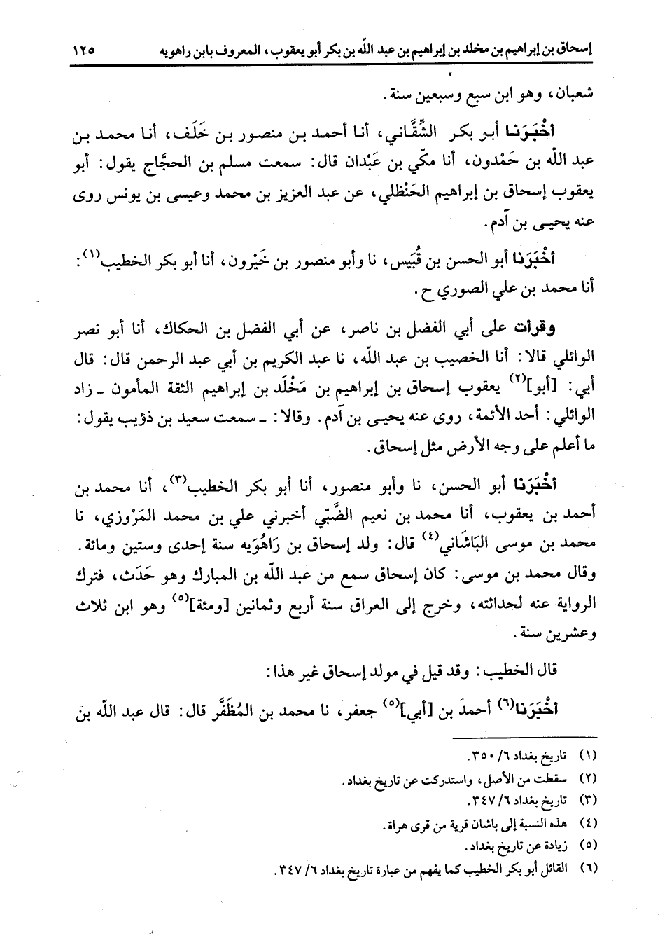شعبان وهو ابن سبع وسبعين سنة أخبرنا أبو بكر الشقاني أنا أحمد بن منصور بن خلف أنا محمد بن عبد الله بن حمدون أنا مكي بن عبدان قال سمعت مسلم بن الحجاج يقول أبو يعقوب إسحاق بن إبراهيم الحنظلي عن عبد العزيز بن محمد وعيسى بن يونس روى عنه يحيى بن آدم أخبرنا أبو الحسن بن قبيس نا وأبو منصور بن خيرون أنا أبو بكر الخطيب (1) أنا محمد بن علي الصوري وقرأت على أبي الفضل بن ناصر عن أبي الفضل بن الحكاك أنا أبو نصر الوائلي قالا أنا الخصيب بن عبد الله نا عبد الكريم بن أبي عبد الرحمن قال قال أبي أبو (2) يعقوب إسحاق بن إبراهيم بن مخلد بن إبراهيم الثقة المأمون زاد الوائلي أحد الأئمة روى عنه يحيى بن آدم وقالا سمعت سعيد بن ذؤيب يقول ما أعلم على وجه الأرض مثل إسحاق أخبرنا أبو الحسن نا وأبو منصور أنا أبو بكر الخطيب أنا محمد بن أحمد بن يعقوب أنا محمد بن نعيم الضبي أخبرني علي بن محمد المروزي نا محمد بن موسى الباشاني (4) قال ولد إسحاق بن راهويه سنة إحدى وستين ومائة وقال محمد بن موسى كان إسحاق سمع من عبد الله بن المبارك وهو حدث فترك الرواية عنه لحداثته وخرج إلى العراق سنة أربع وثمانين ومئة (5) وهو ابن ثلاث وعشرين سنة قال الخطيب وقد قيل في مولد إسحاق غير هذا أخبرنا (6) أحمد بن أبي (5) جعفر نا محمد بن المظفر قال قال عبد الله بن