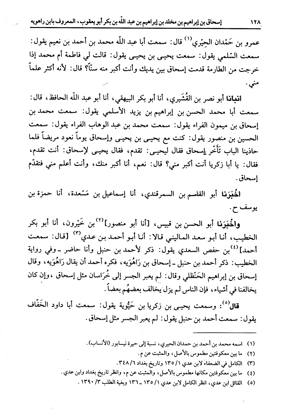 عمرو بن حمدان الحيري (1) قال سمعت أبا عبد الله محمد بن أحمد بن نعيم يقول سمعت السلمي يقول سمعت يحيى بن يحيى يقول قالت لي فاطمة أم محمد إذا خرجت من الطارمة قدمت إسحاق بين يديك وأنت أكبر منه سنا قال لأنه أكثر علما مني أنبأنا أبو نصر بن القشيري أنا أبو بكر البيهقي أنا أبو عبد الله الحافظ قال سمعت أبا محمد الحسن بن إبراهيم بن يزيد الأسلمي يقول سمعت محمد بن إسحاق بن ميمون الفراء يقول سمعت محمد بن عبد الوهاب الفراء يقول سمعت الحسين بن منصور يقول كنت مع يحيى بن يحيى وإسحاق يوما نعود مريضا فلما حاذينا الباب تأخر إسحاق فقال ليحيى تقدم فقال يحيى لإسحاق أنت تقدم فقال يا أبا زكريا أنت أكبر مني قال نعم أنا أكبر منك وأنت أعلم مني فتقدم إسحاق أخبرنا أبو القاسم بن السمرقندي أنا إسماعيل بن مسعدة أنا حمزة بن يوسف وأخبرنا أبو الحسن بن قبيس أنا أبو منصور (2) بن خيرون أنا أبو بكر الخطيب أنا أبو سعد الماليني قالا أنا أبو أحمد بن عدي (3) قال سمعت أحمد (4) بن حفص السعدي يقول ذكر لأحمد بن حنبل وأنا حاضر وفي رواية الخطيب ذكر أحمد بن حنبل إسحاق بن راهويه فكره أحمد أن يقال راهويه وقال إسحاق بن إبراهيم الحنظلي وقال لم يعبر الجسر إلى خراسان مثل إسحاق وإن كان يخالفنا في أشياء فإن الناس لم يزل يخالف بعضهم بعضا قال (5) وسمعت يحيى بن زكريا بن حيوية يقول سمعت أبا داود الخفاف يقول سمعت أحمد بن حنبل يقول لم يعبر الجسر مثل إسحاق