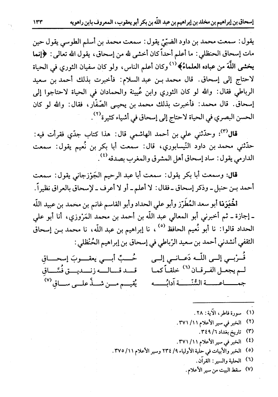 الحداد قالوا نا أبو نعيم الحافظ (5) نا إبراهيم بن عبد الله نا محمد بن إسحاق الثقفي أنشدني أحمد بن سعيد الرباطي في إسحاق بن إبراهيم الحنظلي قربي إلى الله دعاني إلى * حب أبي يعقوب إسحاق لم يجعل الفرقان (6) خلقا كما * قد قاله زنديق فساق جماعة السنة آدابه * يقيم من شذ على ساق (7)