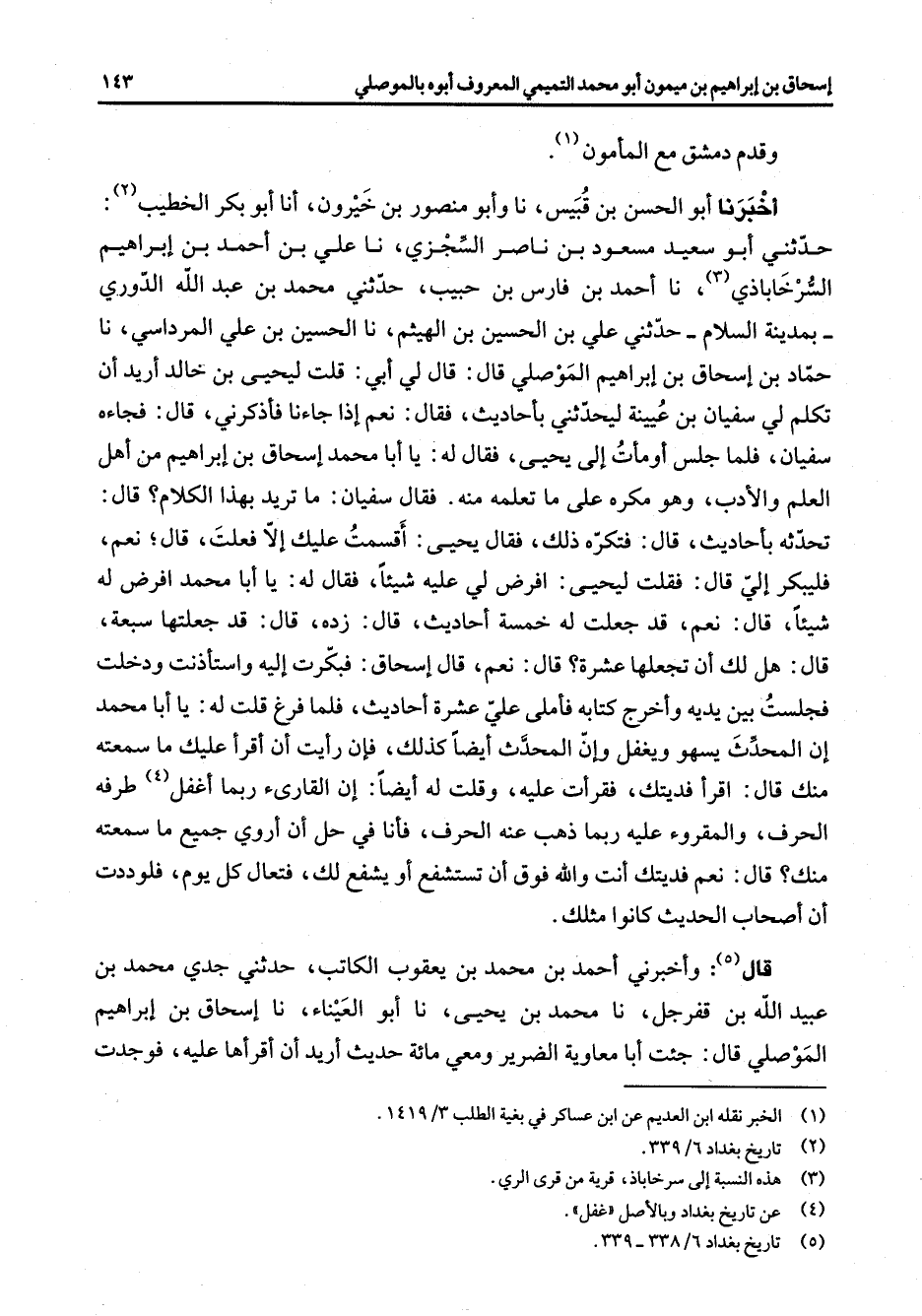 وقدم دمشق مع المأمون (1) أخبرنا أبو الحسن بن قبيس نا وأبو منصور بن خيرون أنا أبو بكر الخطيب (2) حدثني أبو سعيد مسعود بن ناصر السجزي نا علي بن أحمد بن إبراهيم السرخاباذي (3) نا أحمد بن فارس بن حبيب حدثني محمد بن عبد الله الدوري بمدينة السلام حدثني علي بن الحسين بن الهيثم نا الحسين بن علي المرادسي نا حماد بن إسحاق بن إبراهيم الموصلي قال قال لي أبي قلت ليحيى بن خالد أريد أن تكلم لي سفيان بن عيينة ليحدثني بأحاديث فقال نعم إذا جاءنا فأذكرني قال فجاءه سفيان فلما جلس أو مات إلى يحيى فقال له يا أبا محمد إسحاق بن إبراهيم من أهل العلم والأدب وهو مكره على ما تعلمه منه فقال سفيان ما تريد بهذا الكلام قال تحدثه بأحاديث قال فتكره ذلك فقال يحيى أقسمت عليك إلا فعلت قال نعم فليبكر إلي قال فقلت ليحيى افرض لي عليه شيئا فقال له يا أبا محمد افرض له شيئا قال نعم قد جعلت له خمسة أحاديث قال زده قال قد جعلتها سبعة قال هل لك أن تجعلها عشرة قال نعم قال إسحاق فبكرت إليه واستأذنت ودخلت فجلست بين يديه وأخرج كتابه فأملى علي عشر أحاديث فلما فرغ قلت له يا أبا محمد إن المحدث يسهو ويغفل وإن المحدث أيضا كذلك فإن رأيت أن أقرأ عليك ما سمعته منك قال اقرأ فديتك فقرأت عليه وقلت له أيضا إن القارئ ربما أغفل (4) طرفه الحرف والمقروء عليه ربما ذهب عنه الحرف فأنا في حل أن أروي جميع ما سمعته منك قال نعم فديتك أنت والله فوق أن تستشفع أو يشفع لك فتعال كل يوم فلوددت أن أصحاب الحديث كانوا مثلك قال (5) وأخبرني أحمد بن محمد بن يعقوب الكاتب حدثني جدي محمد بن عبيد الله بن قفرجل نا محمد بن يحيى نا أبو العيناء نا إسحاق بن إبراهيم الموصلي قال جئت أبا معاوية الضرير ومعي مائة حديث أريد أن أقرأها عليه فوجدت
