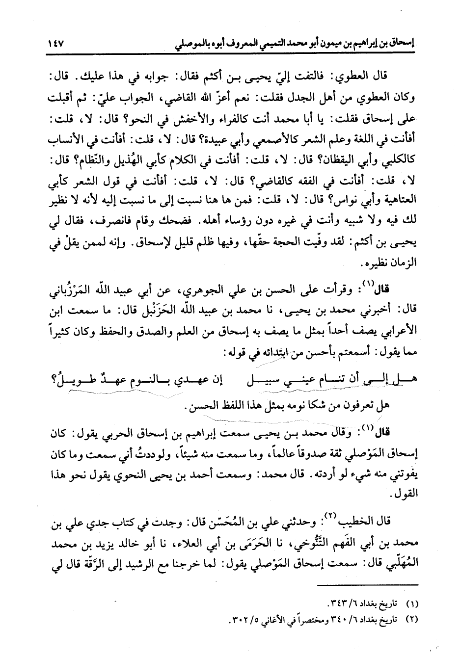 (2) تاريخ بغداد 6 / 340 ومختصرا في الاغاني 5 / 302