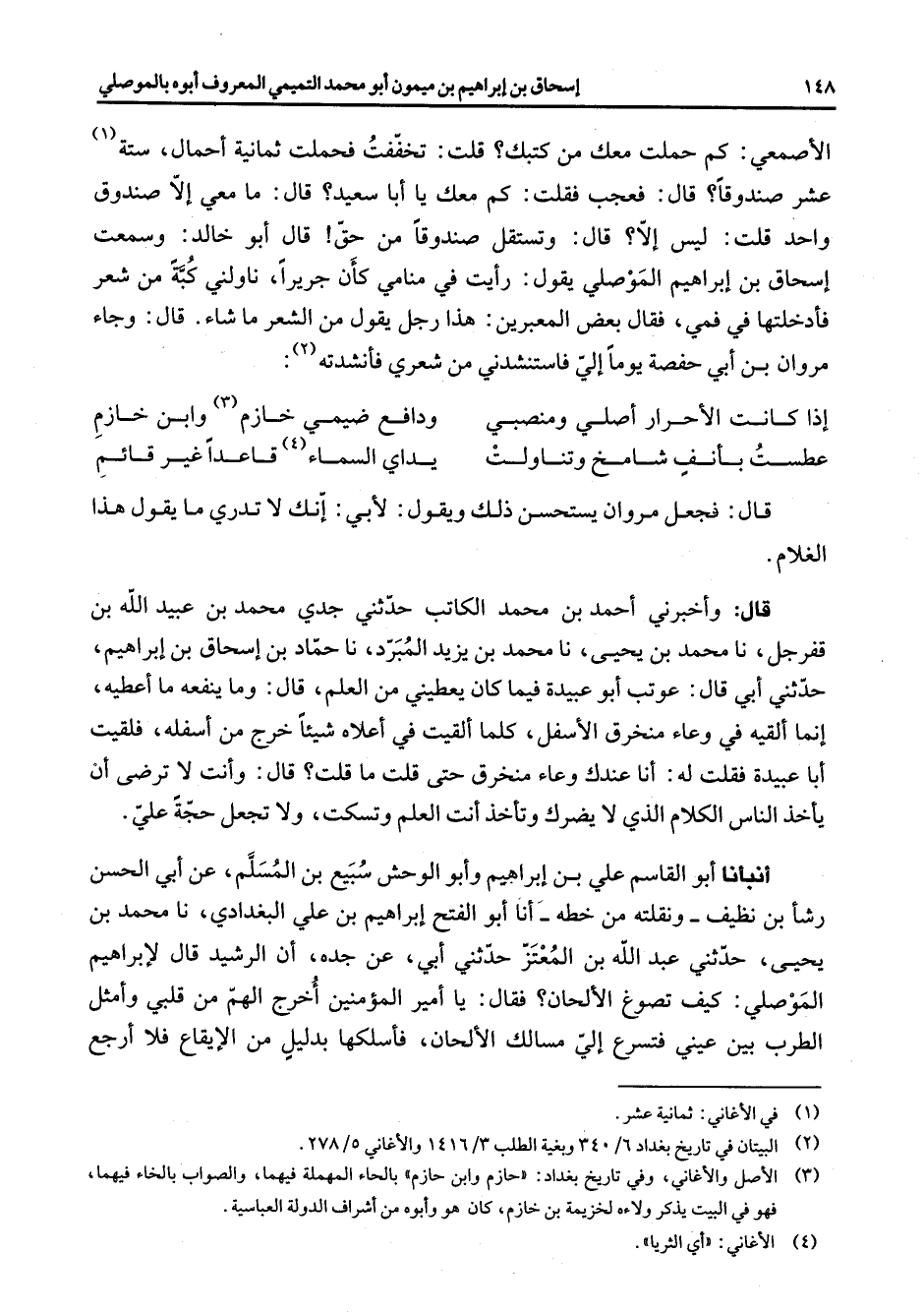 الأصمعي كم حملت معك مكتبك قلت تخففت فحملت ثمانية أحمال ستة (1) عشر صندوقا قال فعجب فقلت كم معك يا أبا سعيد قال ما معي إلى صندوق واحد قلت ليس إلا قال وتستقل صندوقا من حق قال أبو خالد وسمعت إسحاق بن إبراهيم الموصلي يقول رأيت في منامي كأن جريرا ناولني كبة من شعر فأدخلتها في فمي فقال بعض المعبرين هذا رجل يقول من الشعر ما شاء قال وجاء مروان بن أبي حفصة يوما إلي فاستنشدني من شعري فأنشدته (2) * إذا كانت الأحرار أصلي ومنصبي * ودافع ضيمي خازم وابن خازم (3) عطست بأنف شامخ وتناولت * يداي السماء (4) قاعدا غير قائم * قال فجعل مروان يستحسن ذلك ويقول لأبي إنك لا تدري ما يقول هذا الغلام قال وأخبرني أحمد بن محمد الكاتب حدثني جدي محمد بن عبيد الله بن قفرجل نا محمد بن يحيى نا محمد بن يزيد المبرد نا حماد بن إسحاق بن إبراهيم حدثني أبي قال عوتب أبو عبيدة فيما كان يعطيني من العلم قال وما ينفعه ما أعطيه إنما ألقيه في وعاء منخرق الأسفل كلما ألقيت في أعلاه شيئا خرج من أسفله فلقيت أبا عبيدة فقلت له أنا عندك وعاء منخرق حتى قلت ما قلت قال وأنت لا ترضى أن يأخذ الناس الكلام الذي لا يضرك وتأخذ أنت العلم وتسكت ولا تجعل حجة علي أنبأنا أبو القاسم علي بن إبراهيم وأبو الوحش سبيع بن المسلم عن أبي الحسن رشأ بن نظيف ونقلته من خطه أنا أبو الفتح إبراهيم بن علي البغدادي نا محمد بن يحيى حدثني عبد الله بن المعتز حدثني أبي عن جده أن الرشيد قال لإبراهيم الموصلي كيف تصوغ الألحان فقال يا أمير المؤمنين أخرج الهم من قلبي وأمثل الطرب بين عيني فتسرع إلي مسالك الألحان فأسلكها بدليل من الإيقاع فلا أرجع