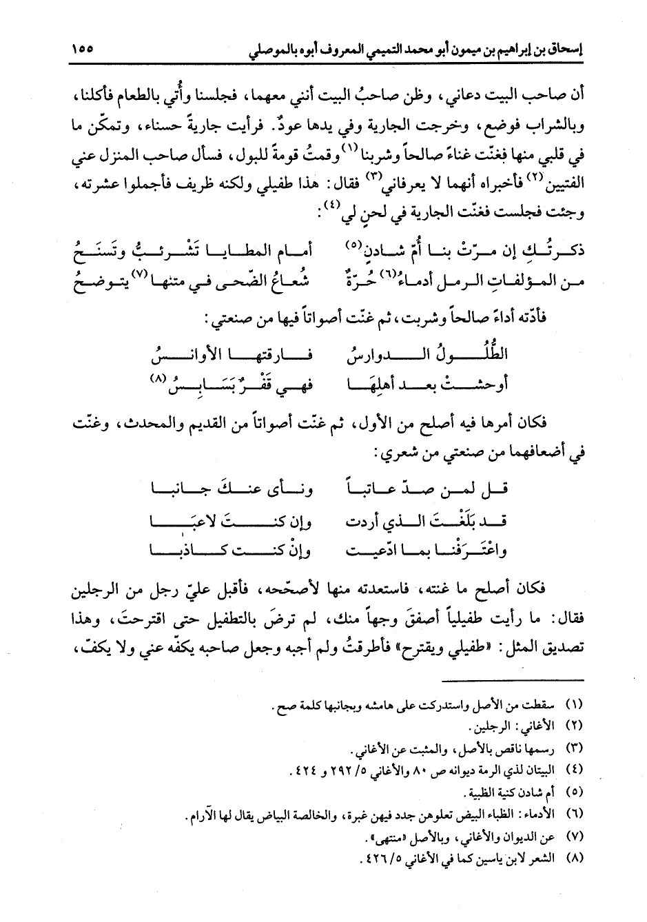 أن صاحب البيت دعاني وظن صاحب البيت أنني معهما فجلسنا وأتي بالطعام فأكلنا وبالشراب فوضع وخرجت الجارية وفي يدها عود فرأيت جارية حسناء وتمكن ما في قلبي منها فغنت غناء صالحا وشربنا (1) وقمت قومه للبول فسأل صاحب المنزل عني الفتيين (2) فأخبراه أنهما لا يعرفاني (3) فقال هذا طفيلي ولكنه ظريف فأجملوا عشرته وجئت فجلست فغنت الجارية في لحن لي (4) ذكرتك إن مرت بنا أن شادن (5) أمام المطايا تشرئب وتسنح من المؤلفات الرمل أدماء (6) حرة * شعاع الضحى في متنها (7) يتوضح * فأدته أداء صالحا وشربت ثم غنت أصواتا فيها من صنعتي * الطلول الدوارس * فارقتها الأوانس أوحشت بعد أهلها * فهي قفر بسابس (8) فكان أمرها فيه أصلح من الأول ثم غنت أصواتا من القديم والمحدث وغنت في أضعافهما من صنعتي من شعري قل لمن صد عاتبا * ونأى عنك جانبا قد بلغت الذي أردت * وإن كنت لاعبا واعترفنا بما ادعيت * وإن كنت كاذبا * فكان أصلح ما غنته فاستعدته منها لأصححه فأقبل علي رجل من الرجلين فقال ما رأيت طفيليا أصفق وجها منك لم ترض بالتطفيل حتى اقترحت وهذا تصديق المثل طفيلي ويقترح فأطرقت ولم أجبه وجعل صاحبه يكفه عني ولا يكف