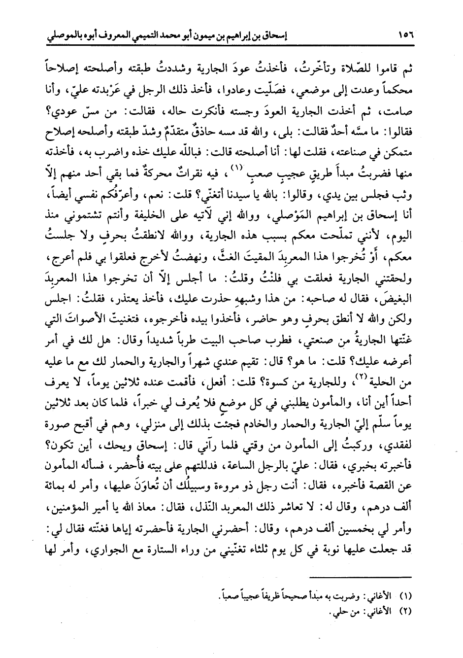 ثم قاموا للصلاة وتأخرت فأخذت عود الجارية وشددت طبقته وأصلحته إصلاحا محكما وعدت إلى موضعي فصليت وعادوا فأخذ ذلك الرجل في عربدته علي وأنا صامت ثم أخذت الجارية العود وجسته فأنكرت حاله فقالت من مس عودي فقالوا ما مسه أحد فقالت بلى والله قد مسه حاذق متقدم وشد طبقته وأصلحه إصلاح متمكن في صناعته فقلت لها أنا أصلحته قالت فبالله عليك خذه واضرب به فأخذته منها فضربت مبدأ طريق عجيب صعب (1) فيه نقرات محركة فما بقي أحد منهم إلا وثب فجلس بين يدي وقالوا باله يا سيدنا أتغني قلت نعم وأعرفكم نفسي أيضا أنا إسحاق بن إبراهيم الموصلي ووالله إني لآتيه على الخليفة وأنتم تشتموني منذ اليوم لأنني تملحت معكم بسبب هذه الجارية ووالله لا نطقت بحرف ولا جلست معكم أو تخرجوا هذا المعربد المقيت الغث ونهضت لأخرج فعلقوا بي فلم أعرج ولحقتني الجارية فعلقت بي فلنت وقلت ما أجلس إلا أن تخرجوا هذا المعربد البغيض فقال له صاحبه من هذا وشبهه حذرت عليك فأخذ يعتذر فقلت اجلس ولكن الله لا أنطق بحرف وهو حاضر فأخذوا بيده فأخرجوه فتغنيت الأصوات التي غنتها الجارية من صنعتي فطرب صاحب البيت طربا شديدا وقال هل لك في أمر أعرضه عليك قلت ما هو قال تقيم عندي شهرا والجارية والحمار لك مع ما عليه من الحلية (2) وللجارية من كسوة قلت أفعل فأقمت عنده ثلاثين يوما لا يعرف أحدا أين أنا والمأمون يطلبني في كل موضع فلا يعرف لي خبرا فلما كان بعد ثلاثين يوما سلم إلي الجارية والحمار والخادم فجئت بذلك إلى منزلي وهم في أقبح صورة لفقدي وركبت إلى المأمون من وقتي فلما رآني قال إسحاق ويحك أين تكون فأخبرته بخبري فقال علي بالرجل الساعة فدللتهم على بيته فأحضر فسأله المأمون عن القصة فأخبره فقال أنت رجل ذو مروءة وسبيلك أن تعاون عليها وأمر له بمائة ألف درهم وقال له لا تعاشر ذلك المعربد النذل فقال معاذ الله يا أمير المؤمنين وأمر لي بخمسين ألف درهم وقال أحضرني الجارية فأحضرته إياها فغنته فقال لي قد جعلت عليها نوبة في كل يوم ثلاثاء تغنيني من وراء الستارة مع الجواري وأمر لها