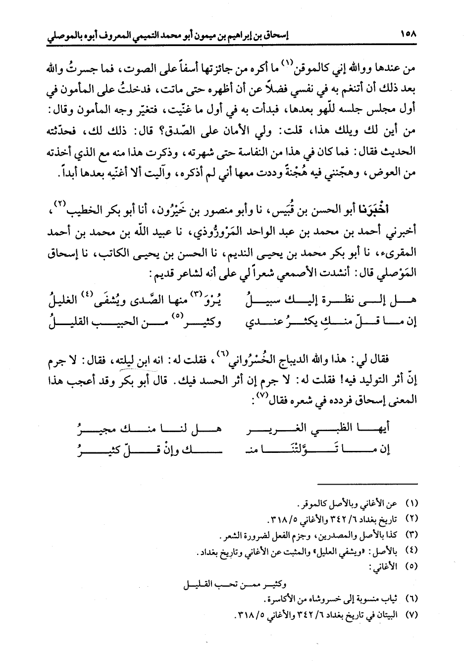 من عندها ووالله إني كالموقن (1) ما أكره من جائزتها أسفا على الصوت فما جسرت والله بعد ذلك أن أتنغم به في نفسي فضلا عن أن أظهره حتى ماتت فدخلت على المأمون في أول مجلس جلسه للهو بعدها فبدأت به في أول ما غنيت فتغير وجه المأمون وقال من أين لك ويلك هذا قلت ولي الأمان على الصدق قال ذلك لك فحدثته الحديث فقال فما كان في هذا من النفاسة حتى شهرته وذكرت هذا منه مع الذي أخذته من العوض وهجنني فيه هجنة وددت معها أني لم أذكره وآليت ألا أغنيه بعدها أبدا أخبرنا أبو الحسن بن قبيس نا وأبو منصور بن خيرون أنا أبو بكر الخطيب (2) أخبرني أحمد بن محمد بن عبد الواحد المروروذي نا عبيد الله بن محمد بن أحمد المقرئ نا أبو بكر محمد بن يحيى النديم نا الحسن بن يحيى الكاتب نا إسحاق الموصلي قال أنشدت الأصمعي شعرا لي على أنه لشاعر قديم هل إلى نظرة إليك سبيل * يرو (3) منها الصدى ويشفى (4) الغليل إن ما قل منك يكثر عندي * وكثير من الحبيب القليل * فقال لي هذا والله الديباج الخسرواني (6) فقلت له إنه ابن ليلته فقال لا جرم إن أثر التوليد فيه فقلت له لا جرم أن أثر الحسد فيك قال أبو بكر وقد أعجب هذا المعنى إسحاق فردده في شعره فقال (7) * أيها الظبي الغرير * هل لنا منك مجير إن ما تولتنا منك * وإن قل كثير