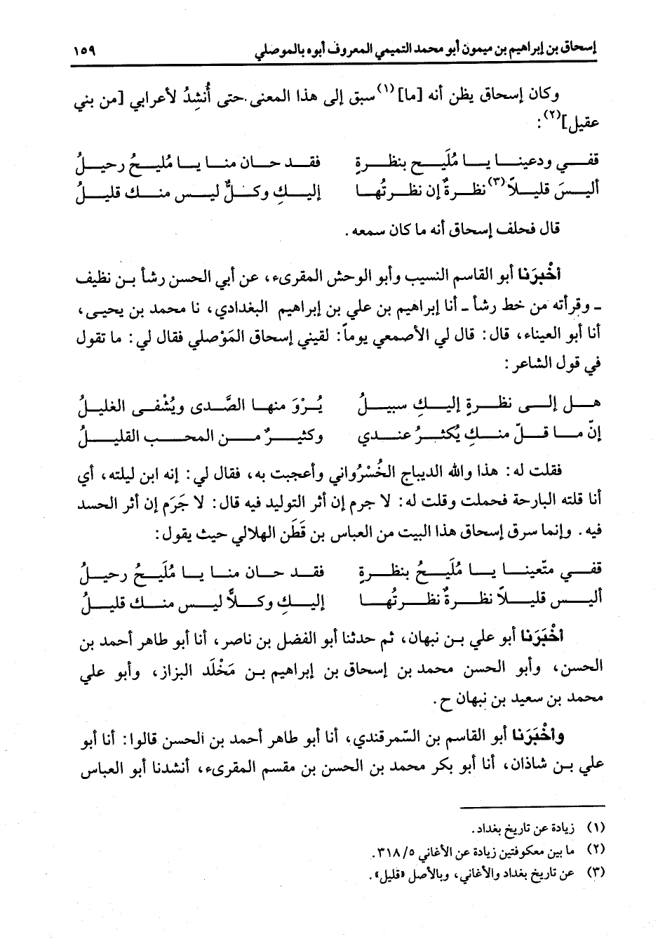 وكان إسحاق يظن أنه ما (1) سبق إلى هذا المعنى حتى أنشد لأعرابي من بني عقيل (2) قفي ودعينا يا مليح بنظرة * فقد حان منا يا مليح رحيل * أليس قليلا (3) نظرة إن نظرتها * إليك وكل ليس منك قليل * قال فحلف إسحاق أنه ما كان سمعه أخبرنا أبو القاسم النسيب وأبو الوحش المقرئ عن أبي الحسن رشأ بن نظيف وقرأته من خط رشأ أنا إبراهيم بن علي بن إبراهيم البغدادي نا محمد بن يحيى أنا أبو العيناء قال قال لي الأصمعي يوما لقيني إسحاق الموصلي فقال لي ما تقول في قول الشاعر * هل إلى نظرة إليك سبيل * يرو منها الصدى ويشفى الغليل إن ما قل منك يكثر عندي * وكثير من المحب القليل * فقلت له هذا والله الديباج الخسرواني وأعجبت به فقال لي إنه ابن ليلته أي أنا قلته البارحة فحملت وقلت له لا جرم إن أثر التوليد فيه قال لا جرم إن أثر الحسد فيه وإنما سرق إسحاق هذا البيت من العباس بن قطن الهلالي حيث يقول * قفي متعينا يا مليح بنظرة * فقد حان منا يا مليح رحيل أليس قليلا نظرة نظرتها * إليك وكلا ليس منك قليل * أخبرنا أبو علي بن نبهان ثم حدثنا أبو الفضل بن ناصر أنا أبو طاهر أحمد بن الحسن وأبو الحسن محمد بن إسحاق بن إبراهيم بن مخلد البزاز وأبو علي محمد بن سعيد بن نبهان وأخبرنا أبو القاسم بن السمرقندي أنا أبو طاهر أحمد بن الحسن قالوا أنا أبو علي بن شاذان أنا أبو بكر محمد بن الحسن بن مقسم المقرئ أنشدنا أبو العباس