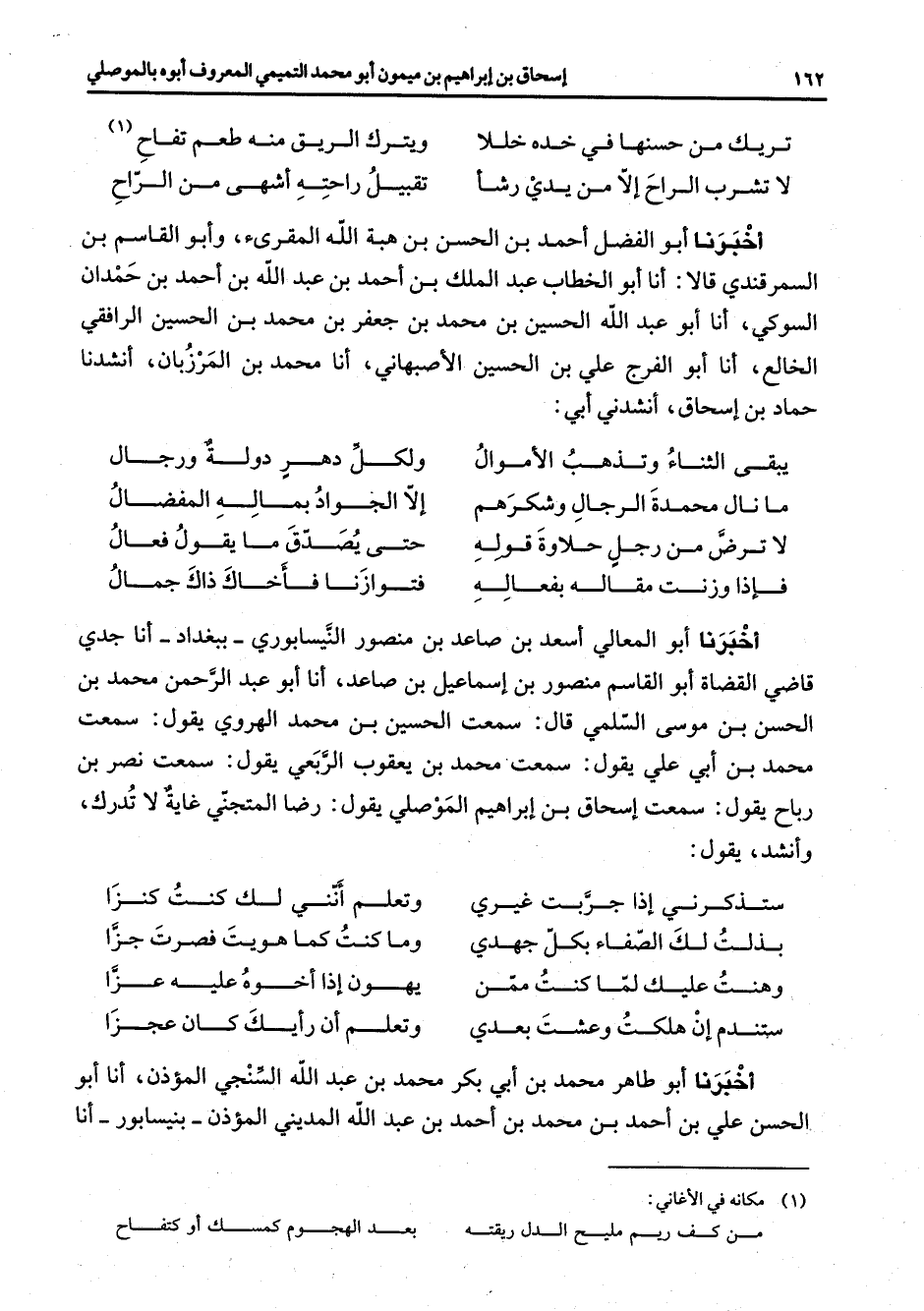 تريك من حسنها في خده خللا * ويترك الريق منه طعم تفاح (1) لا تشرب الراح إلا من يدي رشأ * تقبيل راحته أشهى من الراح * أخبرنا أبو الفضل أحمد بن الحسن بن هبة الله المقرئ وأبو القاسم بن السمرقندي قالا أنا أبو الخطاب عبد الملك بن أحمد بن عبد الله بن أحمد بن حمدان السوكي أنا أبو عبد الله الحسين بن محمد بن جعفر بن محمد بن الحسين الرافقي الخالع أنا أبو الفرج علي بن الحسين الأصبهاني أنا محمد بن المرزبان أنشدنا حماد بن إسحاق أنشدني أبي * يبقى الثناء وتذهب الأموال * ولكل دهر دولة ورجال ما نال محمدة الرجال وشكرهم * إلا الجواد بماله المفضال لا ترض من رجل حلاوة قوله حتى يصدق ما يقول فعال فإذا وزنت مقاله بفعاله * فتوازنا فأخاك ذاك جمال * أخبرنا أبو المعالي أسعد بن صاعد بن منصور النيسابوري ببغداد أنا جدي قاضي القضاة أبو القاسم منصور بن إسماعيل بن صاعد أنا أبو عبد الرحمن محمد بن الحسن بن موسى السلمي قال سمعت الحسين بن محمد الهروي يقول سمعت إ محمد بن أبي علي يقول سمعت محمد بن يعقوب الربعي يقول سمعت نصر بن رباح يقول سمعت إسحاق بن إبراهيم الموصلي يقول رضا المتجني غاية لا تدرك وأنشد يقول * ستذكرني إذا جربت غيري * وتعلم أنني لك كنت كنزا بذلت لك الصفاء بكل جهدي * وما كنت كما هويت فصرت جزا * وهنت عليك لما كنت ممن * يهون إذا أخوه عليه عزا ستندم إن هلكت وعشت بعدي * وتعلم أن رأيك كان عجزا * أخبرنا أبو طاهر محمد بن أبي بكر محمد بن عبد الله السنجي المؤذن أنا أبو الحسن علي بن أحمد بن محمد بن أحمد بن عبد الله المديني المؤذن بنيسابور أنا
