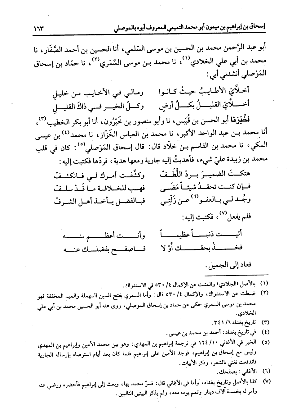 أبو عبد الرحمن محمد بن الحسين بن موسى السلمي أنا الحسين بن أحمد الصفار نا محمد بن أبي علي الخلادي (1) نا محمد بن موسى السمري (2) نا حماد بن إسحاق الموصلي أنشدني أبي أخلاي الأطايب حيث كانوا * ومالي في الأخايب من خليل أخلاي القليل بكل أرض * وكل الخير في ذاك القليل * أخبرنا أبو الحسن بن قبيس نا وأبو منصور بن خيرون أنا أبو بكر الخطيب (3) انا محمد بن عبد الواحد الأكبر نا محمد بن العباس الخزاز نا محمد (4) بن عيسى المكي نا محمد بن القاسم بن خلاد قال قال إسحاق الموصلي (5) كان في قلب محمد بن زبيدة علي شئ فأهديت إليه جارية ومعها هدية فردها فكتبت إليه * هتكت الضمير برد اللطف * وكشفت أمرك لي فانكشف فإن كنت تحقد شيئا مضى * فهب للخلافة ما قد سلف وجد لي بالعفو (6) عن زلتي * فبالفضل يأخذ أهل الشرف * فلم يفعل (7) فكتبت إليه أتيت ذنبا عظيما * وأنت أعظم منه فخذ بحقك أو لا * فاصفح بفضلك عنه * فعاد إلى الجميل
