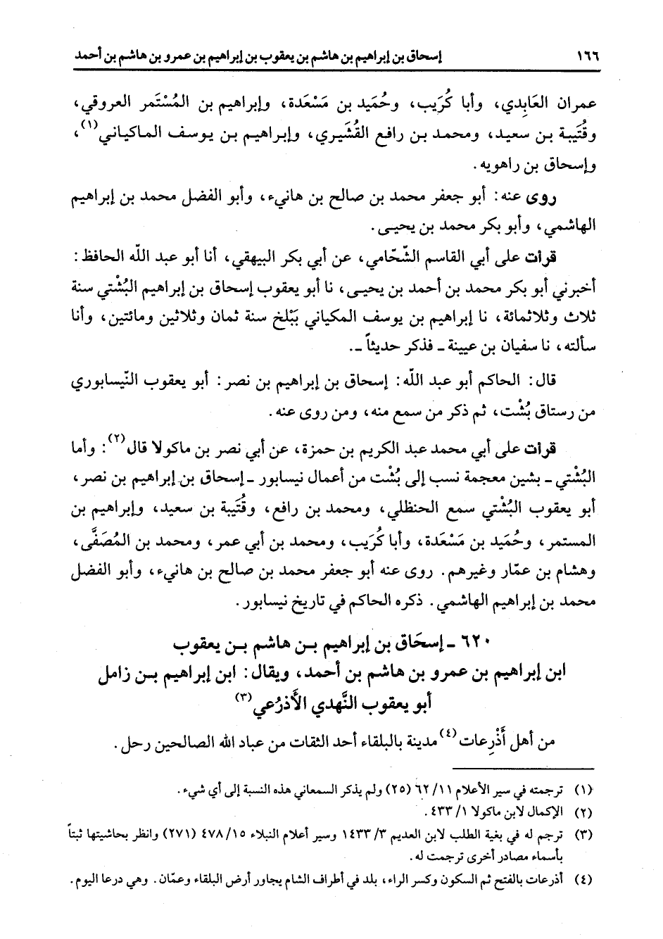 620 - إسحاق بن إبراهيم بن هاشم بن يعقوب ابن إبراهيم بن عمرو بن هاشم بن أحمد ويقال ابن إبراهيم بن زامل أبو يعقوب النهدي الأذرعي (3) من أهل أذرعات (4) مدينة بالبلقاء أحد الثقات من عباد الله الصالحين رحل