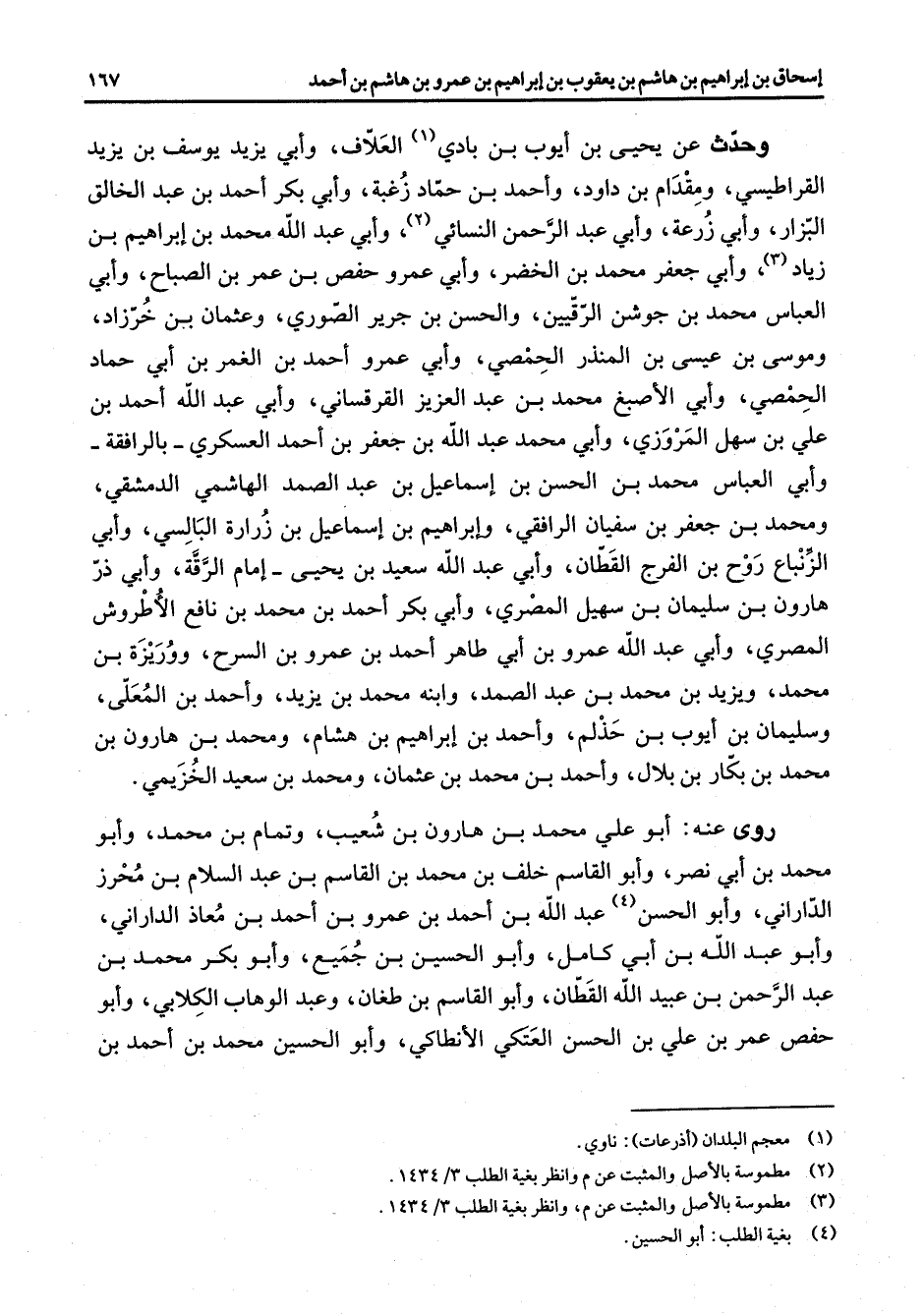 وحدث عن يحيى بن أيوب بن بادي (1) العلاف وأبي يزيد يوسف بن يزيد القراطيسي ومقدام بن داود وأحمد بن حماد زغبة وأبي بكر أحمد بن عبد الخالق البزار وأبي زرعة وأبي عبد الرحمن النسائي (2) وأبي عبد الله محمد بن إبراهيم بن زياد (3) وأبي جعفر محمد بن الخضر وأبي عمرو حفص بن عمر بن الصباح وأبي العباس محمد بن جوشن الرقيين والحسن بن جرير الصوري وعثمان بن خرزاد وموسى بن عيسى بن المنذر الحمصي وأبي عمرو أحمد بن الغمر بن أبي حماد الحمصي وأبي الأصبغ محمد بن عبد العزيز القرقساني وأبي عبد الله أحمد بن علي بن سهل المروزي وأبي محمد عبد الله بن جعفر بن أحمد العسكري بالرافقة وأبي العباس محمد بن الحسن بن إسماعيل بن عبد الصمد الهاشمي الدمشقي ومحمد بن جعفر بن سفيان الرافقي وإبراهيم بن إسماعيل بن زرارة البالسي وأبي الزنباع روح بن الفرج القطان وأبي عبد الله سعيد بن يحيى إمام الرقة وأبي ذر هارون بن سليمان بن سهيل المصري وأبي بكر أحمد بن محمد بن نافع الأطروش المصري وأبي عبد الله عمرو بن أبي طاهر أحمد بن عمرو بن السرح ووريزة بن محمد ويزيد بن محمد بن عبد الصمد وابنه محمد بن يزيد وأحمد بن المعلى وسليمان بن أيوب بن حذلم وأحمد بن إبراهيم بن هشام ومحمد بن هارون بن محمد بن بكار بن بلال وأحمد بن محمد بن عثمان ومحمد بن سعيد الخزيمي روى عنه أبو علي محمد بن هارون بن شعيب وتمام بن محمد وأبو محمد بن أبي نصر وأبو القاسم خلف بن محمد بن القاسم بن عبد السلام بن محرز الداراني وأبو الحسن (4) عبد الله بن أحمد بن عمرو بن أحمد بن معاذ الداراني وأبو عبد الله بن أبي كامل وأبو الحسين بن جميع وأبو بكر محمد بن عبد الرحمن بن عبيد الله القطان وأبو القاسم بن طغان وعبد الوهاب الكلابي وأبو حفص عمر بن علي بن الحسن العتكي الأنطاكي وأبو الحسين محمد بن أحمد بن